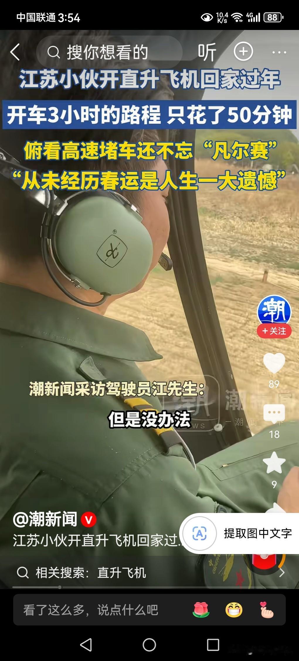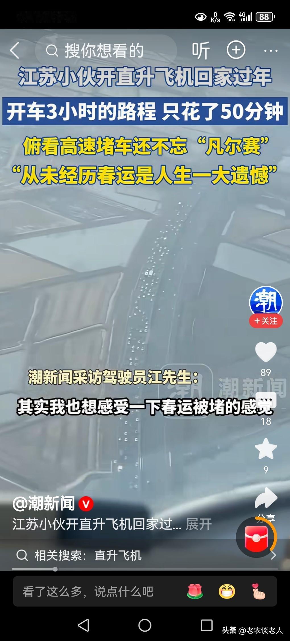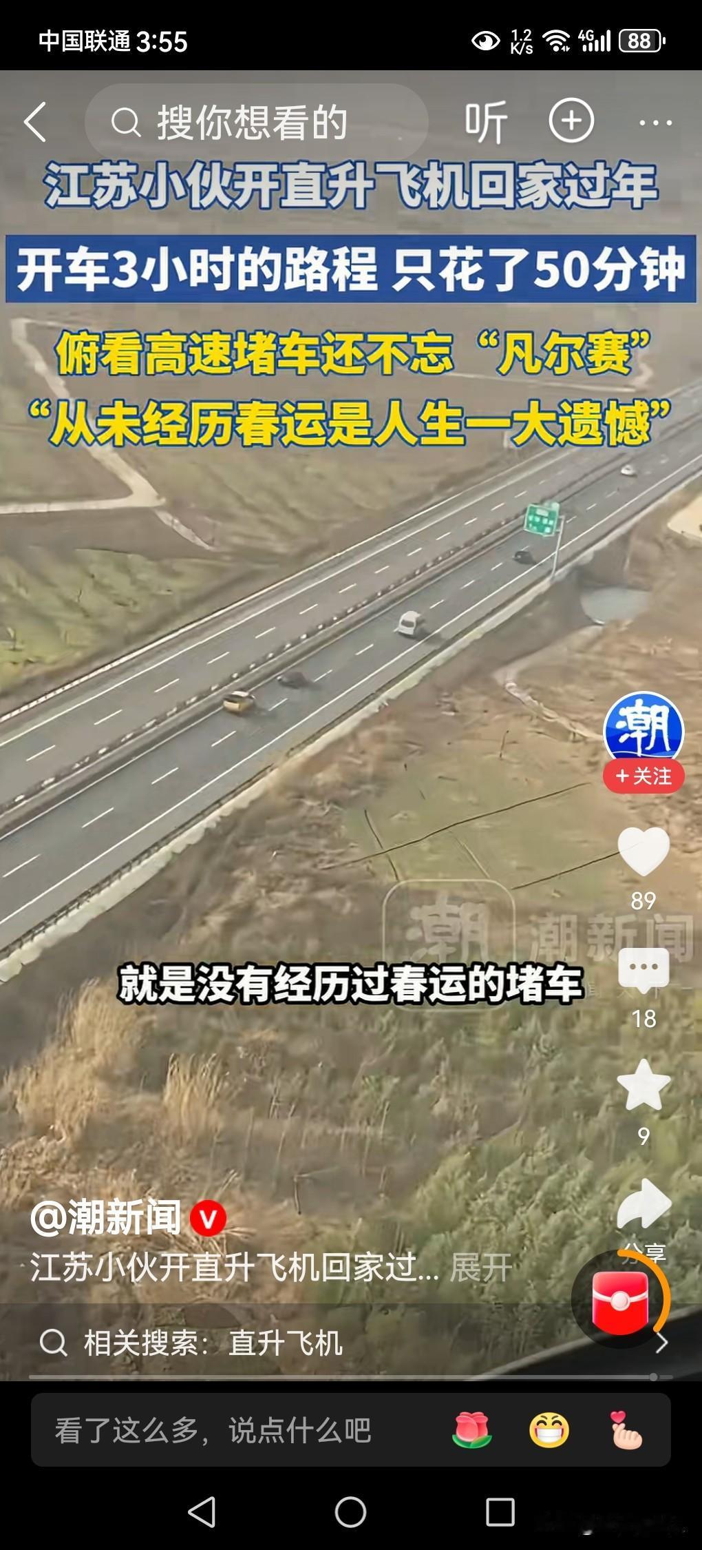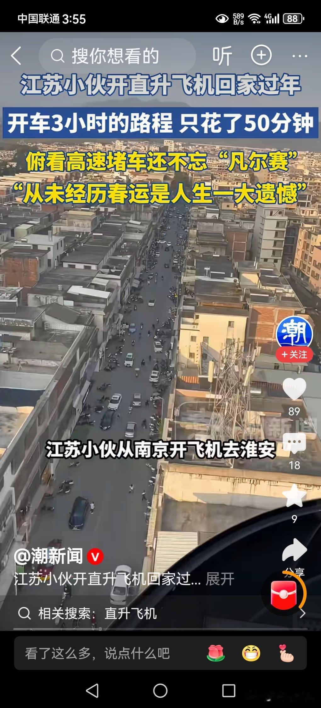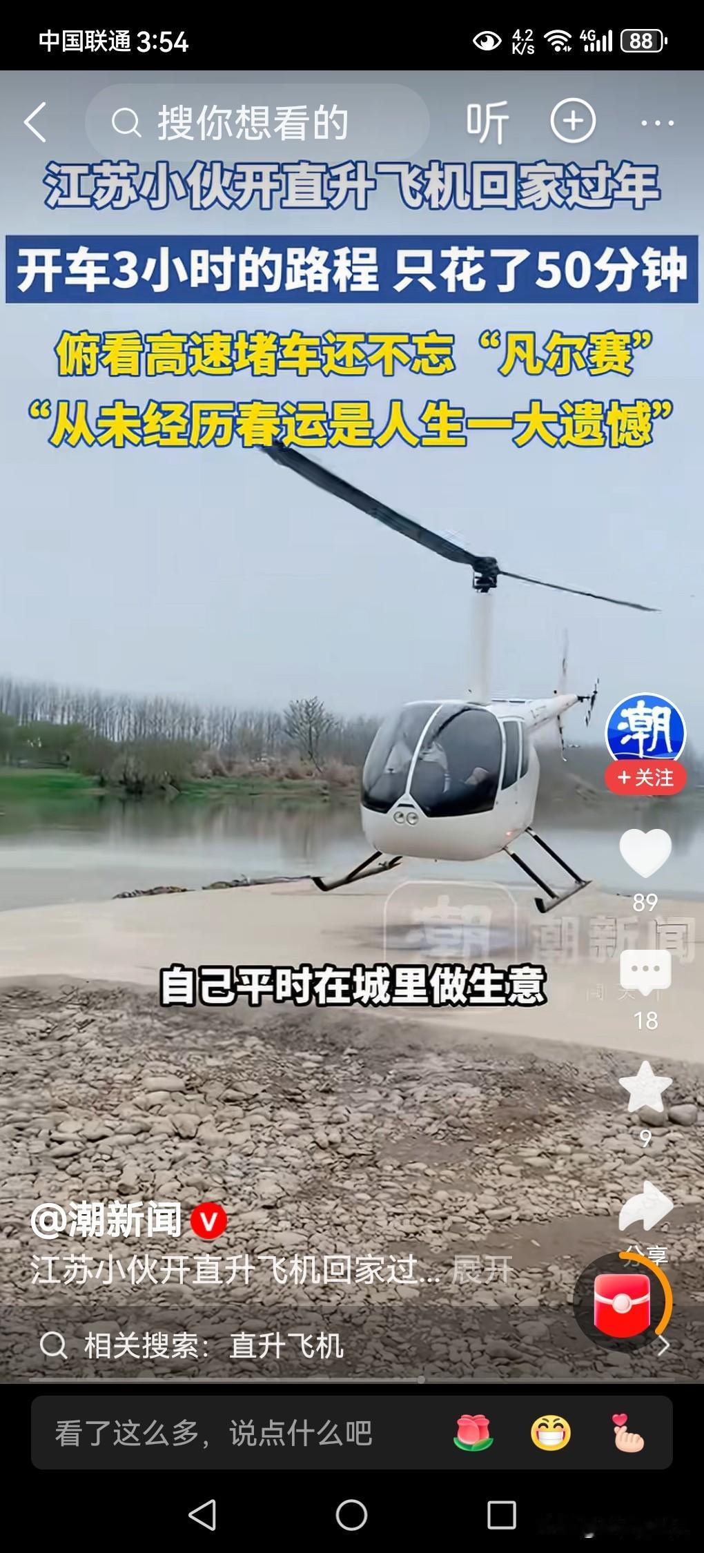 春节来临,大家回家过年,选择的交通工具,要么是乘高铁,要么是坐飞机,要么是自驾私家车,要么骑摩托车,有没有人选择开直升飞机回家? 若是说开直升飞机回家过年,好像是一种神话,或让人认为一定是百万亿富豪,谁家能买得起飞机?谁家能租得起飞机?有谁有这种能力开飞机回家?都是不可想象的事情! 据媒体2月14日报道,江苏一小伙子开着直升飞机春节回家过年,有图有视频有真相,是千真万确的事情,并不是神话,而是现实的中国人能够有这种能力的具体体现。 小伙子说,春节在不堵车的情况下,开车从高速需要三个小时才能到家,现在开直升飞机只要50分钟就到家了。 随着我国科学技术的发展,经济的繁荣,社会的进步,小型直升飞机即将进入普通百姓家,并不是一件很难的事情。 这若是对外国朋友来说,确实是一件让人羡慕死了的一件事情,真为中国人骄傲。 年底的快乐是卡罗拉给的江苏小伙子开直升飞机回家过年