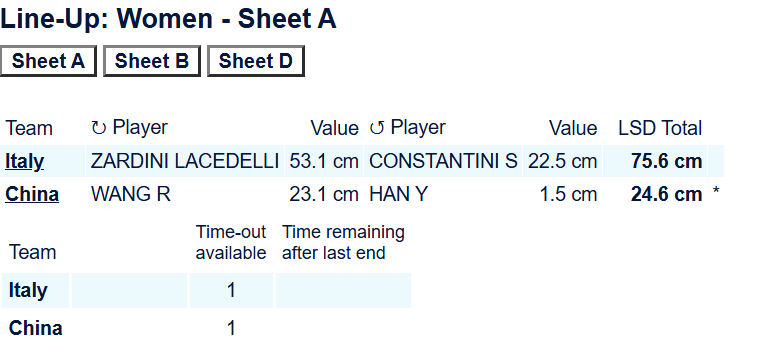 【奥运冰壶】女子循环赛 意大利75.6 cm-中国 24.6cm中国队开场后手权(刚才草台班子把数据输入错了,把韩雨女士的个位数好壶陷害成55.9)