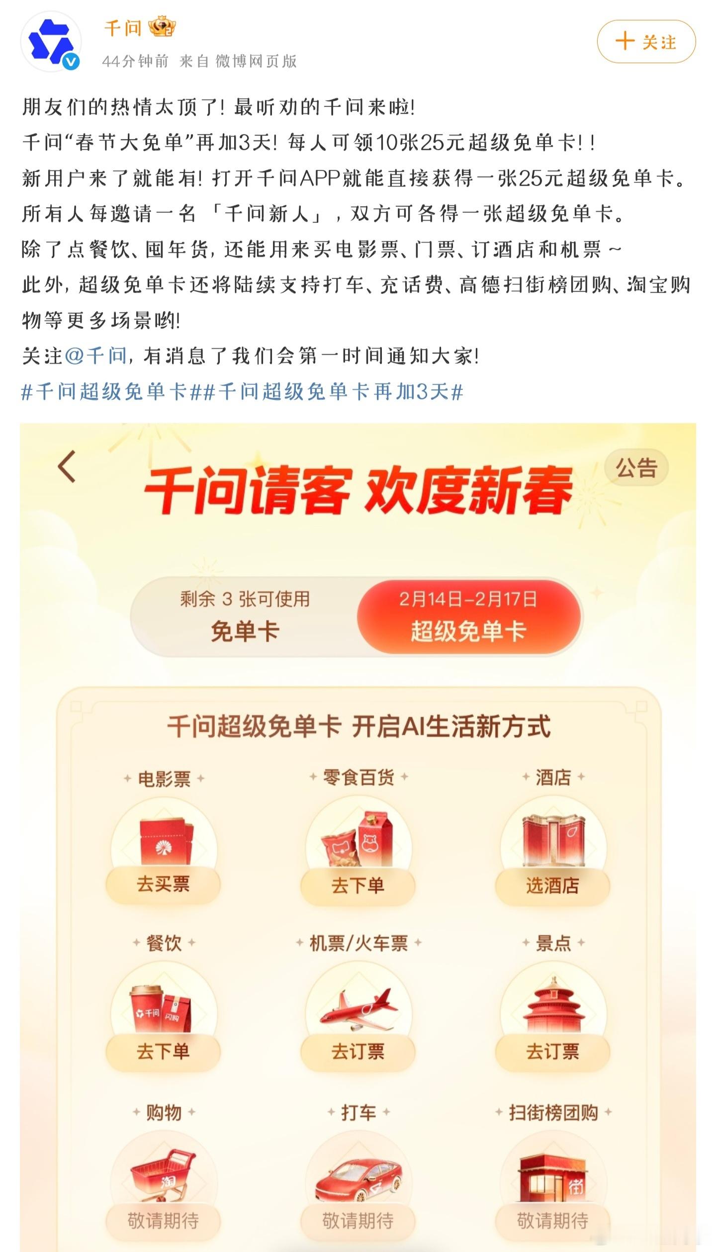 千问免单卡再加三天本来就因为过于火爆,延期到2月底的千问免单活动,这次宣布再延期3天。上周活动刚出的当天上午,因为过于火爆,千问App也出现了服务器繁忙,毕竟这种实打实的、不设门槛、不搞规则的福利活动,正常人都会想薅一薅。免单范围也从简单的茶饮覆盖到九大品类,什么订机票、电影票、景点门票、机票酒店,基本涵盖了日常生活的方方面面。这也意味着,千问这次活动正式进华为全民性质的赛博狂欢,这大概是今年开年大模型助手赛道最有网感和人味儿的一次策划。