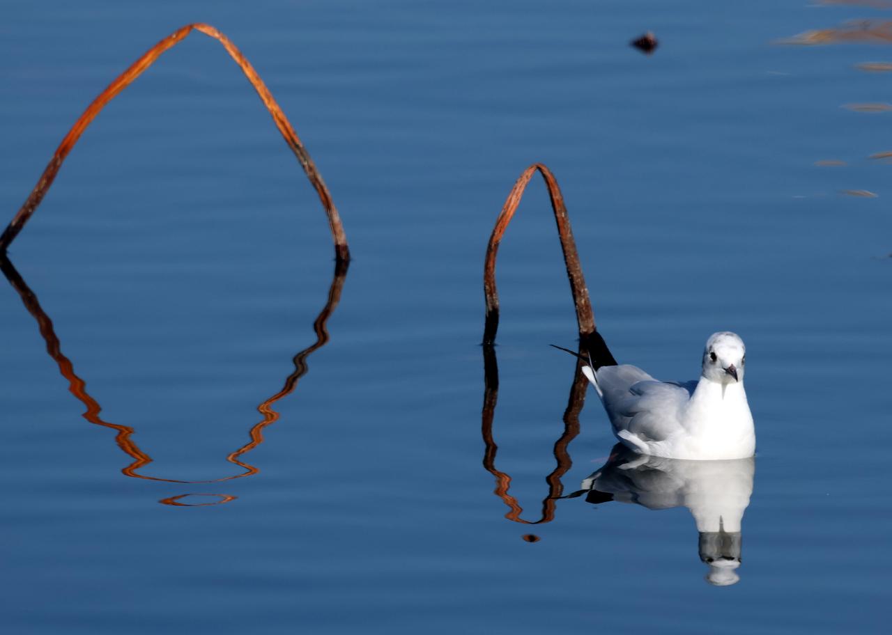 昆明赏鸥韵! 远至西伯利亚的小精灵红嘴鸥年年来昆明越冬,我也年年都拍它。 飞板、标准照、单只照、群体照等都拍过了,今天利用枯荷衬托,换种拍法,努力拍点韵味,借以迎接即将到来的马年春节!