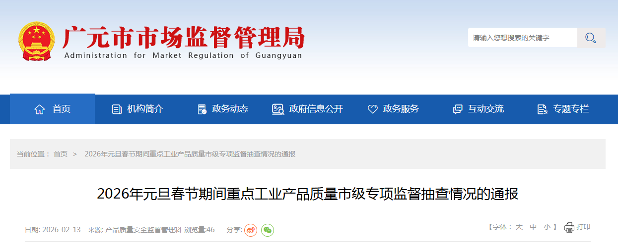 中国质量新闻网讯据四川省广元市市场监督管理局网站消息,2026年1月起,广元市市场监督管理局组织开展元旦、春节期间重点工业产品质量监督抽查工作,抽查产品包括烤火炉、电热毯、商用燃气灶、电动自行车锂电池等34种产品,共抽取本市生产、销售单位产品100批次。