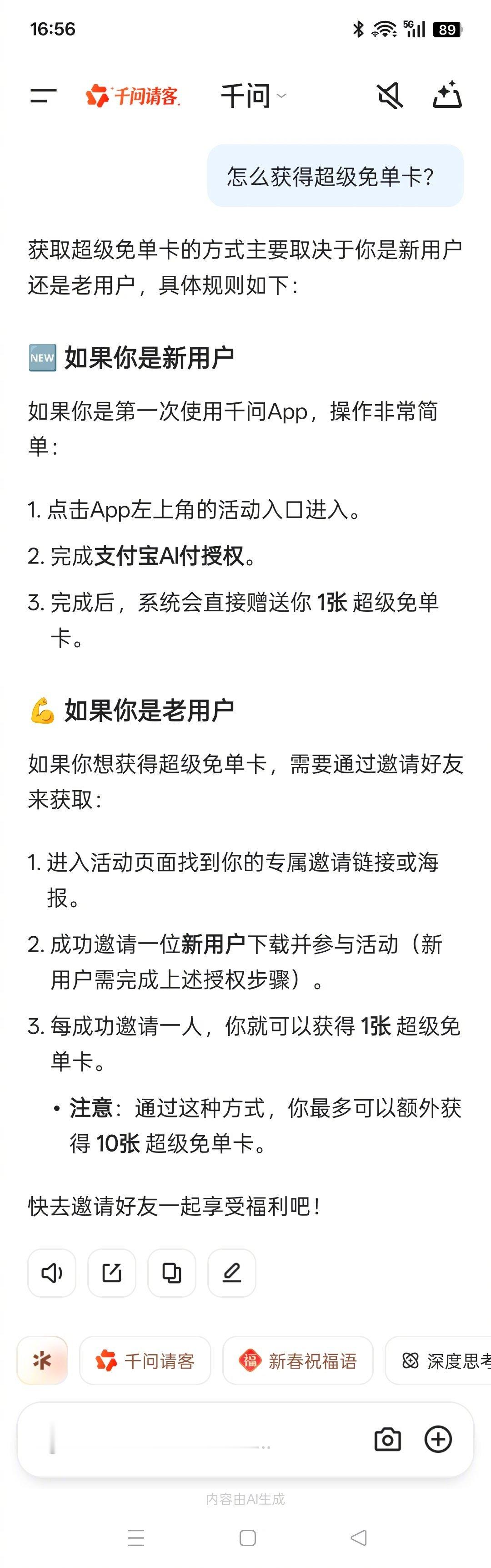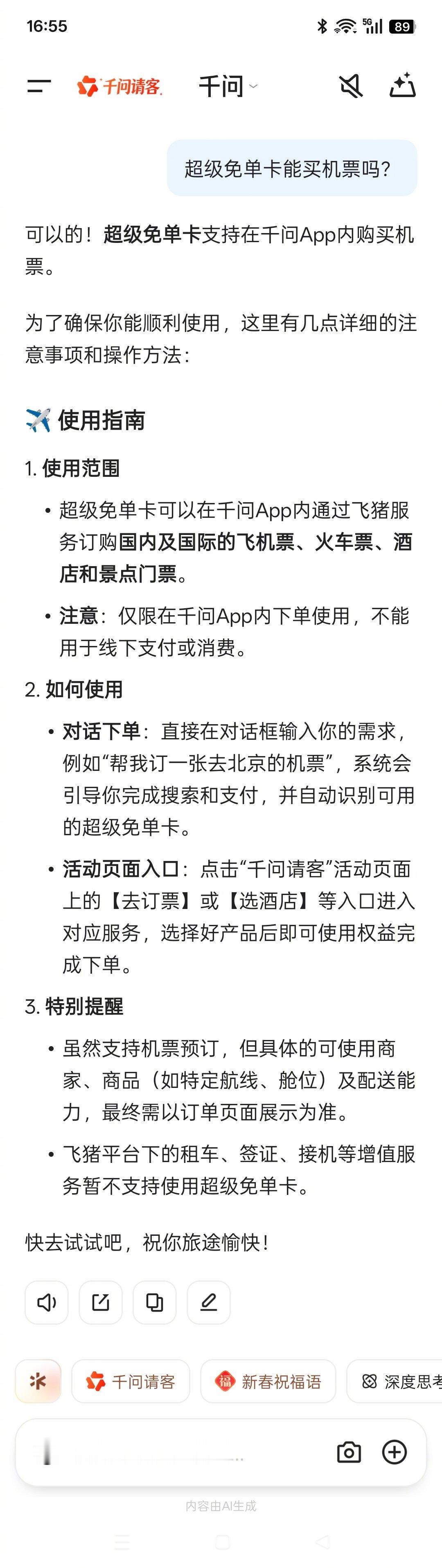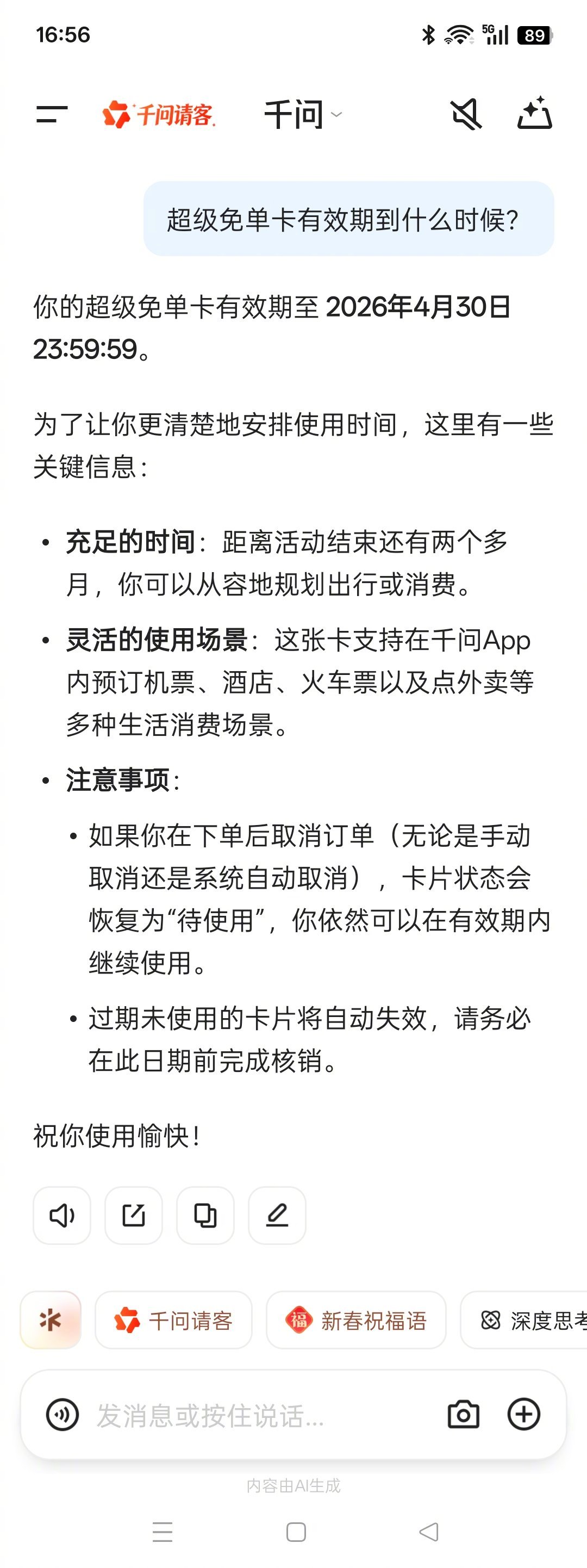 千问免单卡再加三天 千问刚送完奶茶,现在继续送福利,超级免单卡再加三天,连买机票都可以用,这点航空君觉得确实值得点赞,春运的时候能省点就省点,一路上那么多消费,这波福利真是能帮大家薅不少羊毛。厂商送福利就该大大方方直接给,弄一大堆门槛遮遮掩掩的没意思,千问这种简单粗暴地直接给其实最受大家欢迎。现在AI程序那么多,千问这么大动作,至少在知名度方面是提得足足的,下边就看怎么接住这波泼天的流量了。