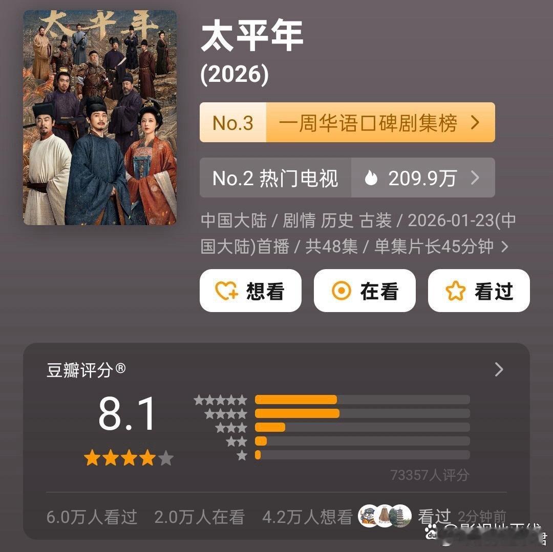 《生命树》豆瓣口碑出炉,8.1分的成绩,可以归类成优秀作品了,而此时,《太平年》