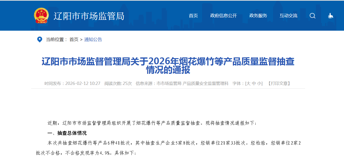 辽阳市市场监督管理局关于2026年烟花爆竹等产品质量监督抽查情况的通报