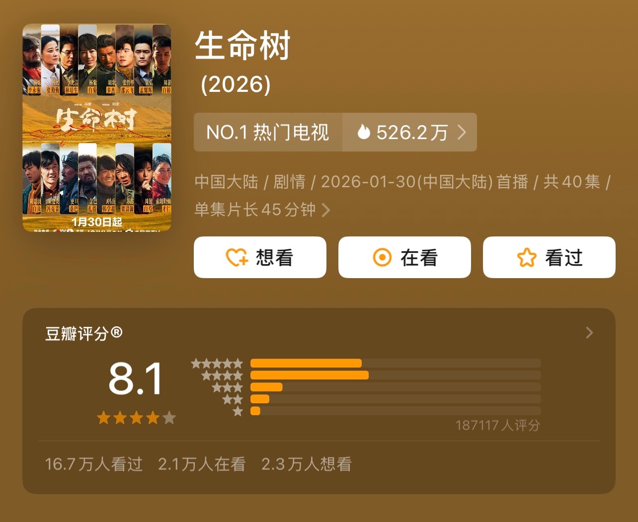 生命树豆瓣开分8.1太平年豆瓣评分涨至8.12026年开年,由杨磊执导,白宇、周雨彤、朱亚文、董勇、倪大红等主演的历史大剧《太平年》与正午阳光出品,李雪执导,杨紫、胡歌主演的剧集《生命树》相继在央视一套、八套播出。近日两部剧在豆瓣先后开分,默契地打了个平手,均获的8.1的高分。截至目前,《太平年》首轮播出已收官,《生命树》的故事也逐渐接近尾声。单从评分和讨论度上看,这两部品质剧集也算是给2026开了个好头。
