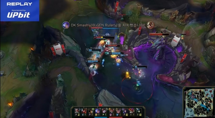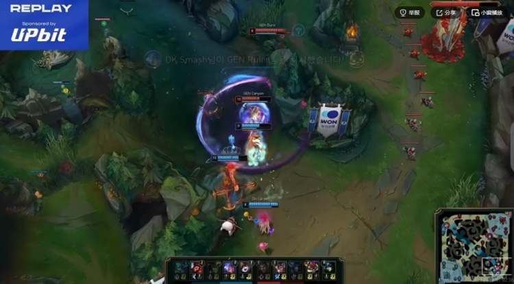 [8:45]GEN拿下第一条小龙!Lucid猴子gank下路开转配合队友强行击杀Ruler库奇!终结赏金还是Smash芸阿娜拿的,不过GEN中野支援到位换掉了猴子!镜头一转DK下路2V2打出线杀,Lucid猴子支援帮助队伍又打一波1换2!劣势打回来了一些!