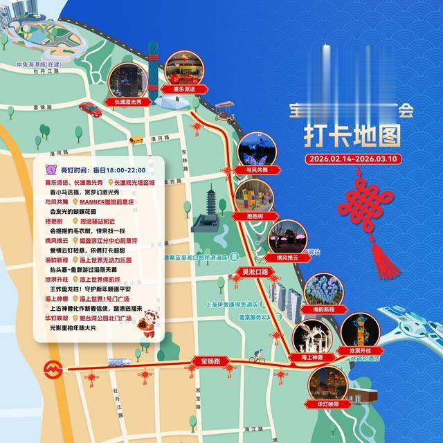 市民游客可以以挂满传统中国结灯的宝杨路为起点,沿着这条喜庆、热烈的迎宾大道漫步,开启新春夜游之旅。