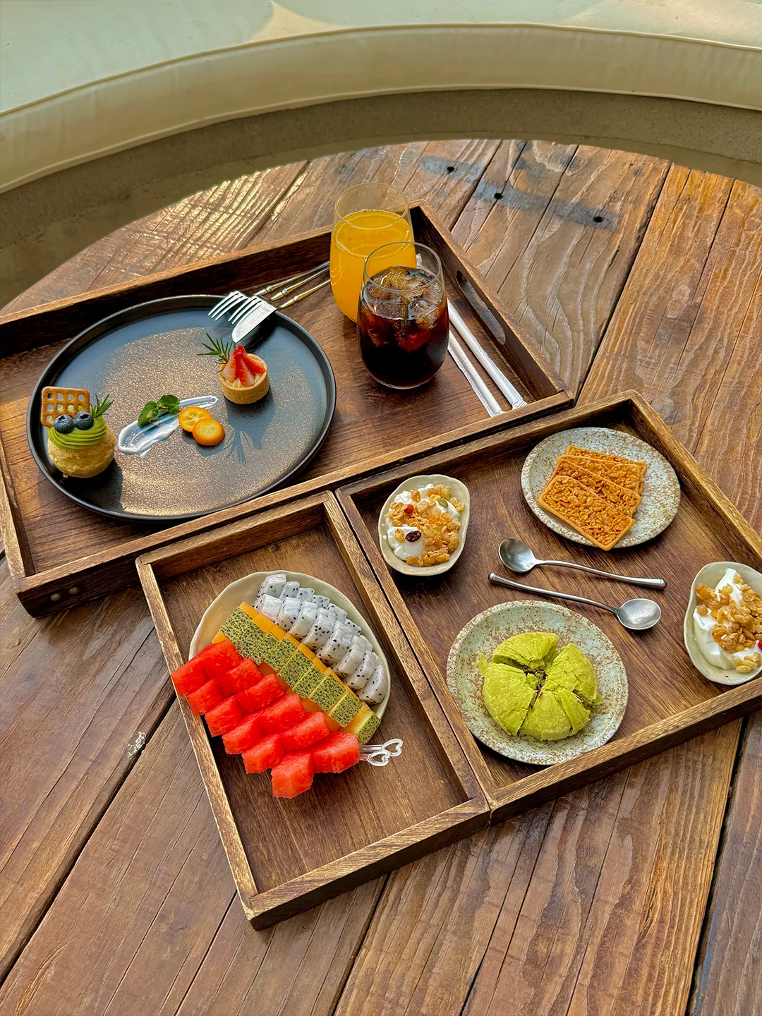房间里的布置也很合我心意,简约又不失质感,原木家具搭配浅色系床品,显得格外温馨,这种惬意感是在外面感受不到的。还有下午茶可以品尝哦~