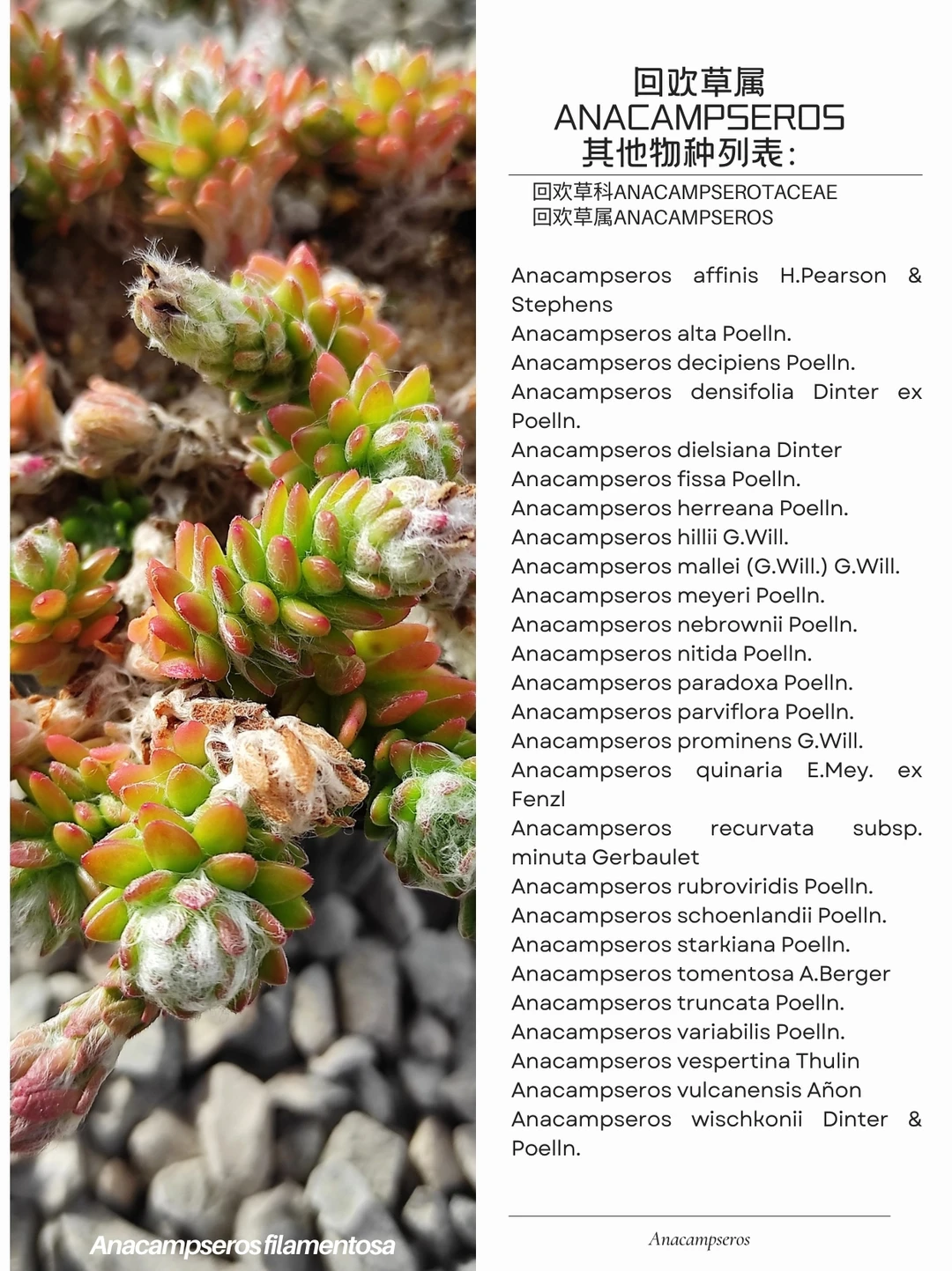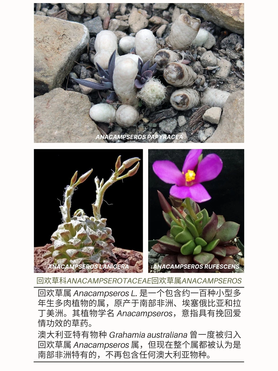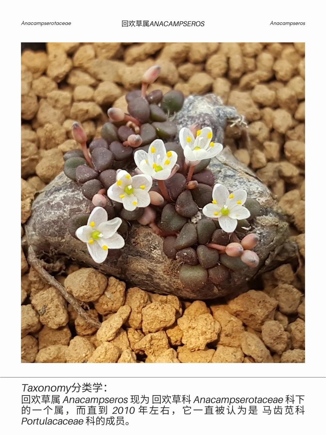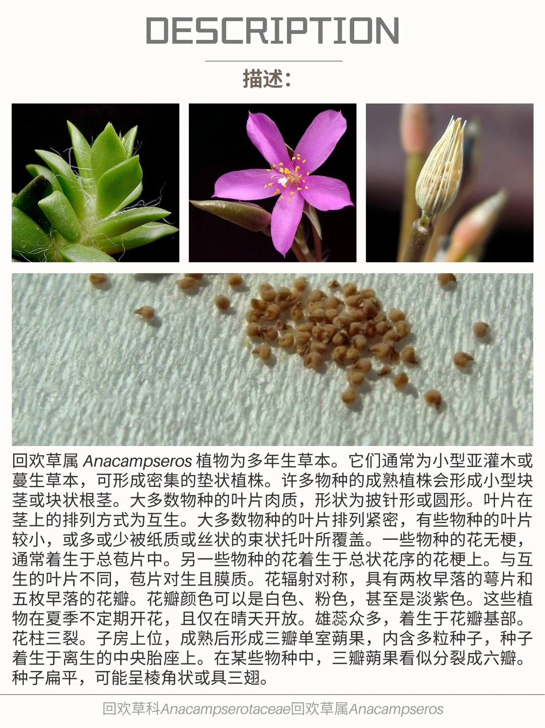 回欢草属 Anacampseros L. 是一个包含约一百种小型多年生多肉植物的,回欢草科Anacampserotaceae属,原产于南部非洲、埃塞俄比亚和拉丁美洲。其植物学名 Anacampseros,意指具有挽回爱情功效的草药。