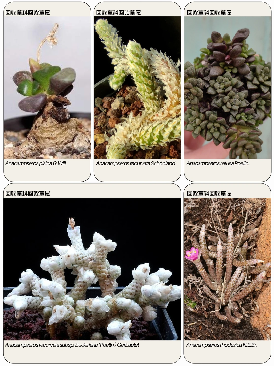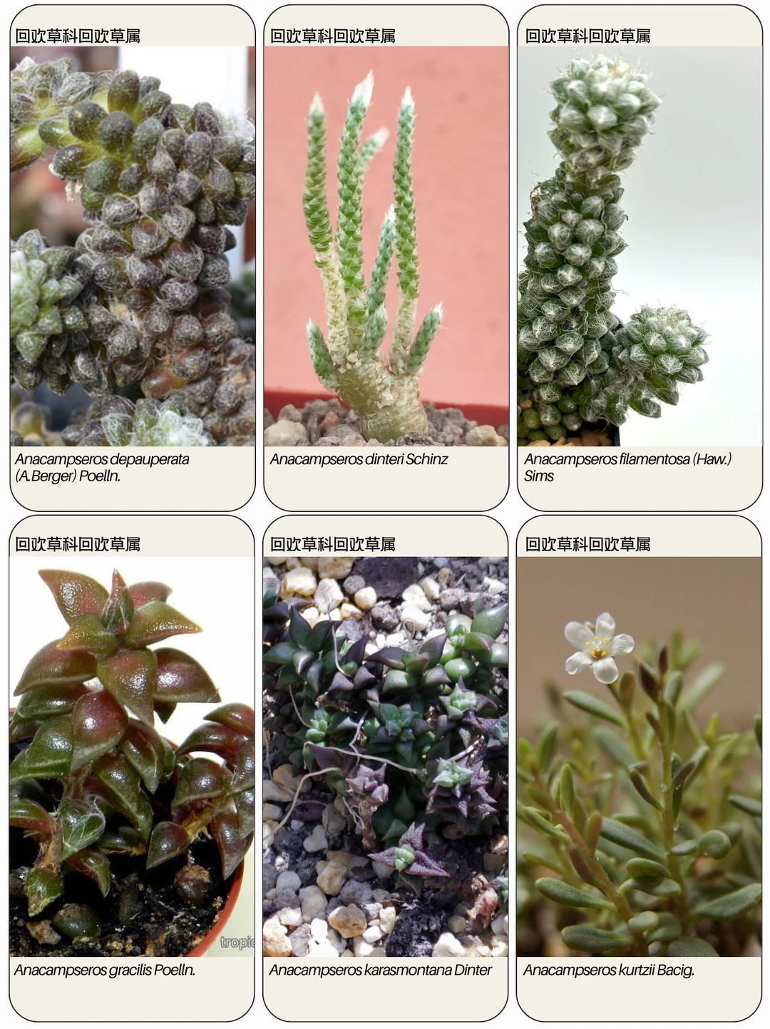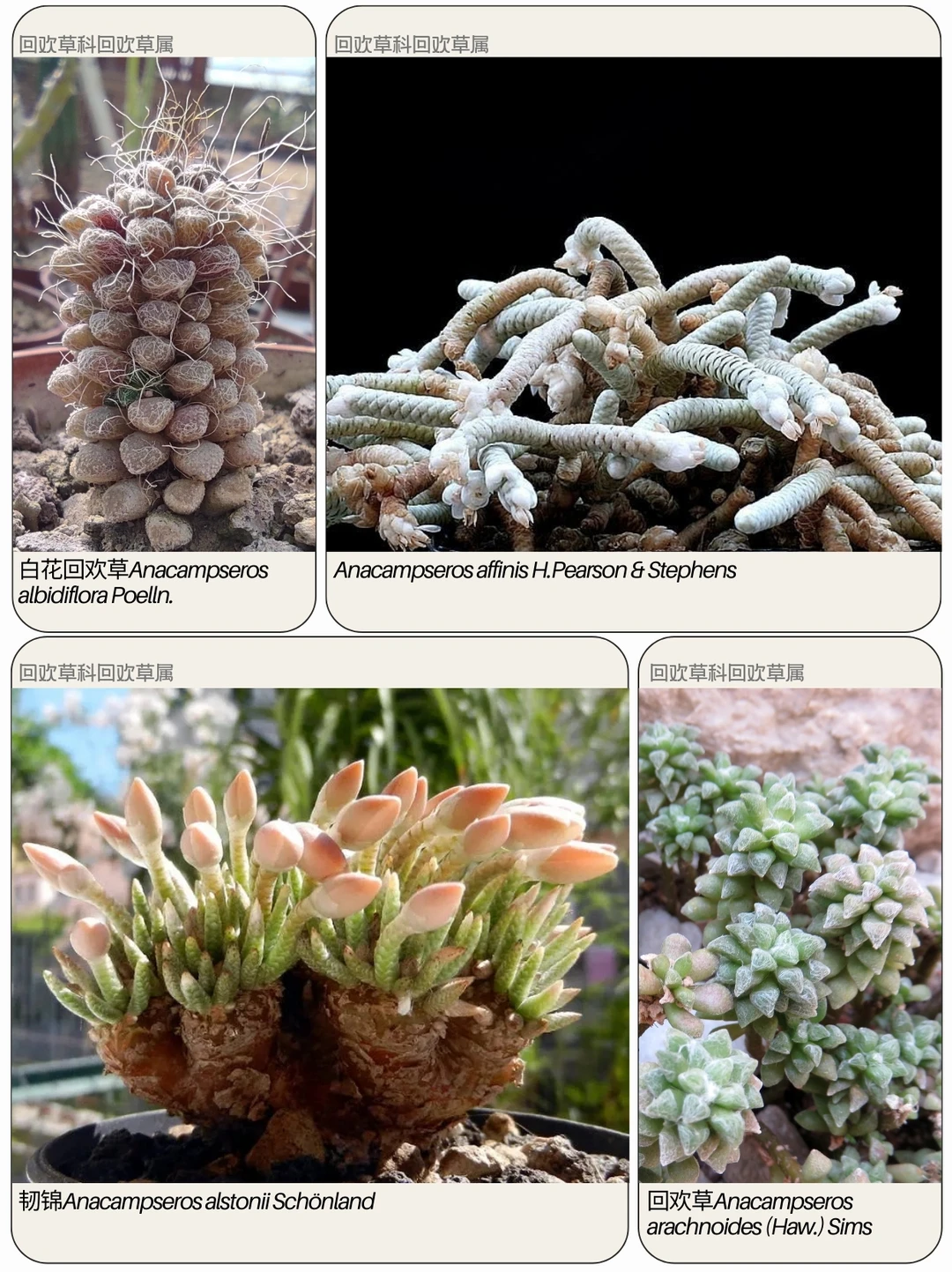 回欢草属 Anacampseros L. 是一个包含约一百种小型多年生多肉植物的,回欢草科Anacampserotaceae属,原产于南部非洲、埃塞俄比亚和拉丁美洲。其植物学名 Anacampseros,意指具有挽回爱情功效的草药。
