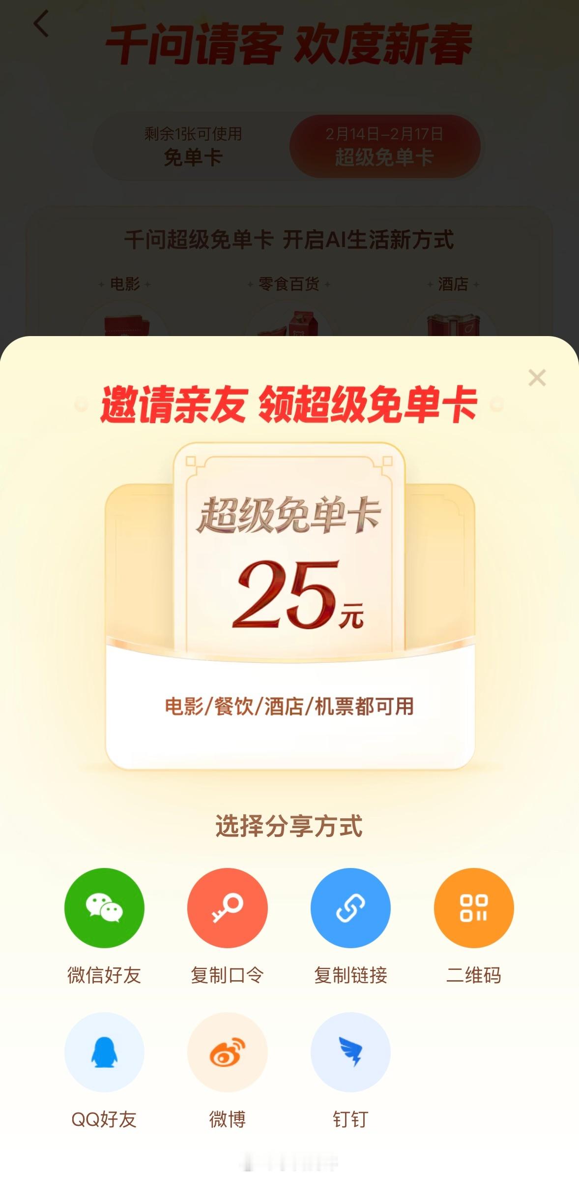 千问第二波免单卡来了这次是电影酒店机票打车购物团购等等必须邀请才能获得免单卡