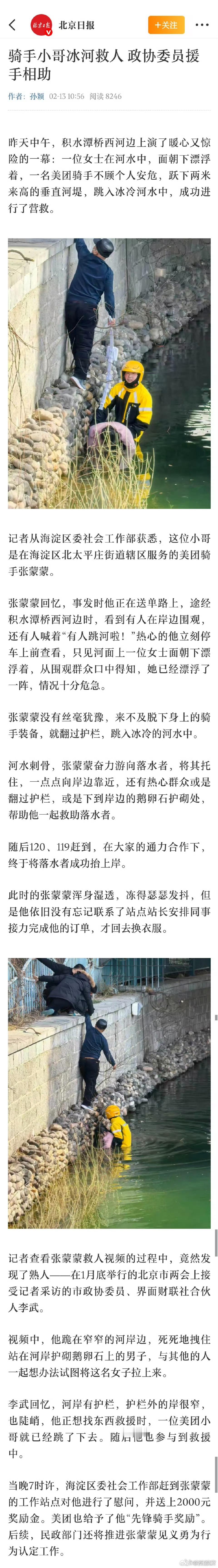 跳冰河救人骑手获见义勇为奖金外卖小哥救人获荣誉和奖金大过年的还有好人出手救人。这真是今日阳间新闻了。冰水里救人实在要有莫大的勇气。 这位美团骑手太赞了。真善美往往就在这些普通人身上闪光。关键是我们要记住这些闪光,奖励太应该给了[强]。希望骑手小哥一切好好的,过个好年。