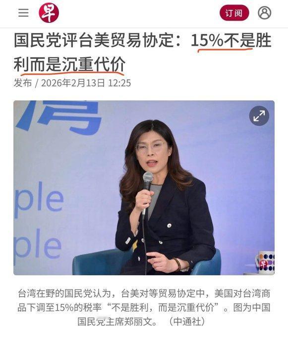 被美国莫名其妙征收15%关税,还要无条件开放岛内农产品和汽车市场,再送上5千亿美元大礼,把台积电变美积电。如果能把这种协议说成是胜利,肯定比阿Q有本事。