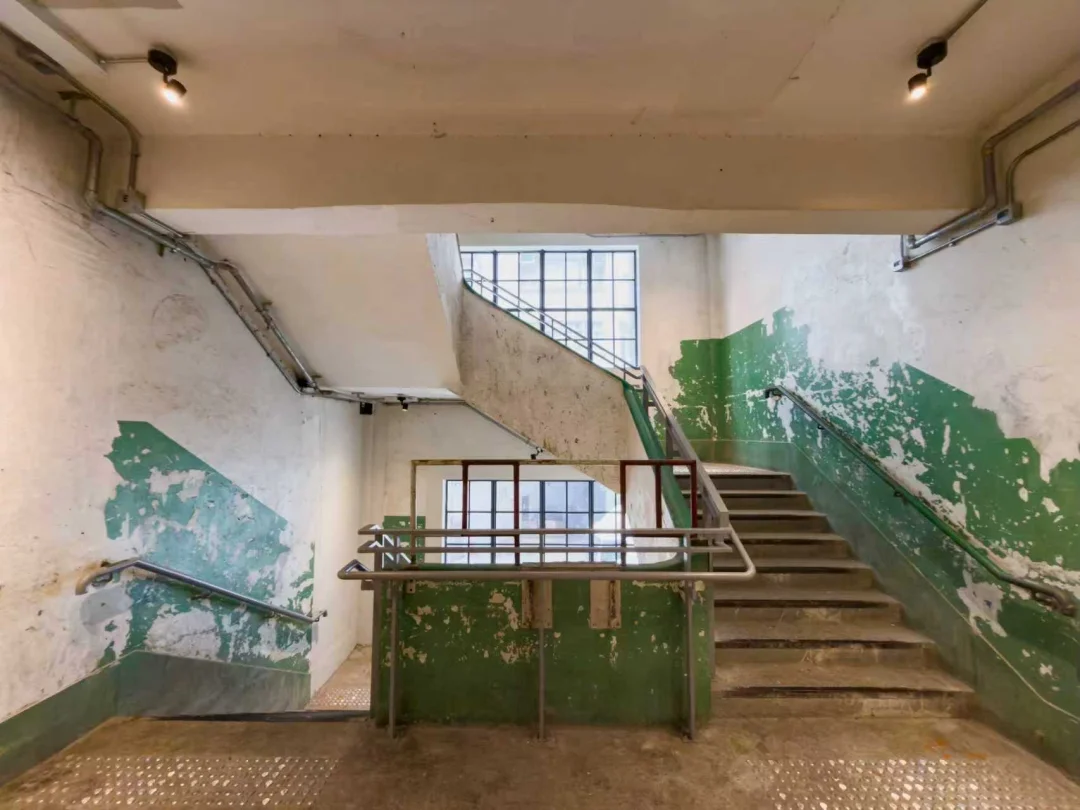 完整保留的旧楼梯,褪色的绿色油漆满是时间痕迹,阳光透过窗户洒下来,氛围感直接拉满,很适合拍情绪片。