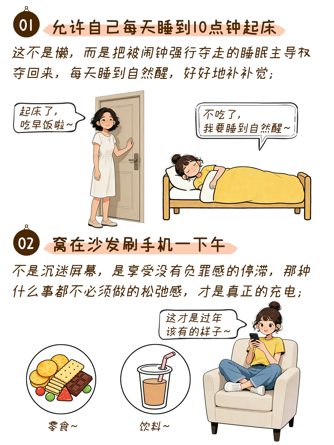 允许自己“理直气壮地摆烂”; 利用春节假期给自己好好“充充电”; 把自己从“社会时钟”和“工具属性”里捞出来; 还给那个只是活着就足够了的自己;