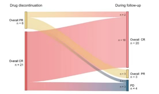 该研究共纳入27例停药后病情稳定的iMCD-TAFRO患者,经中位31个月随访监测,23例患者(占比85.2%)病情持续稳定且达到生化维度完全缓解,其中20例实现临床完全缓解。数据显示,患者停药后6个月、1年、3年的病情稳定率分别为96.3%、85.2%、85.2%;仅4例患者病情恶化,且均发生在停药1年内,截至末次随访,全部27例患者均存活。