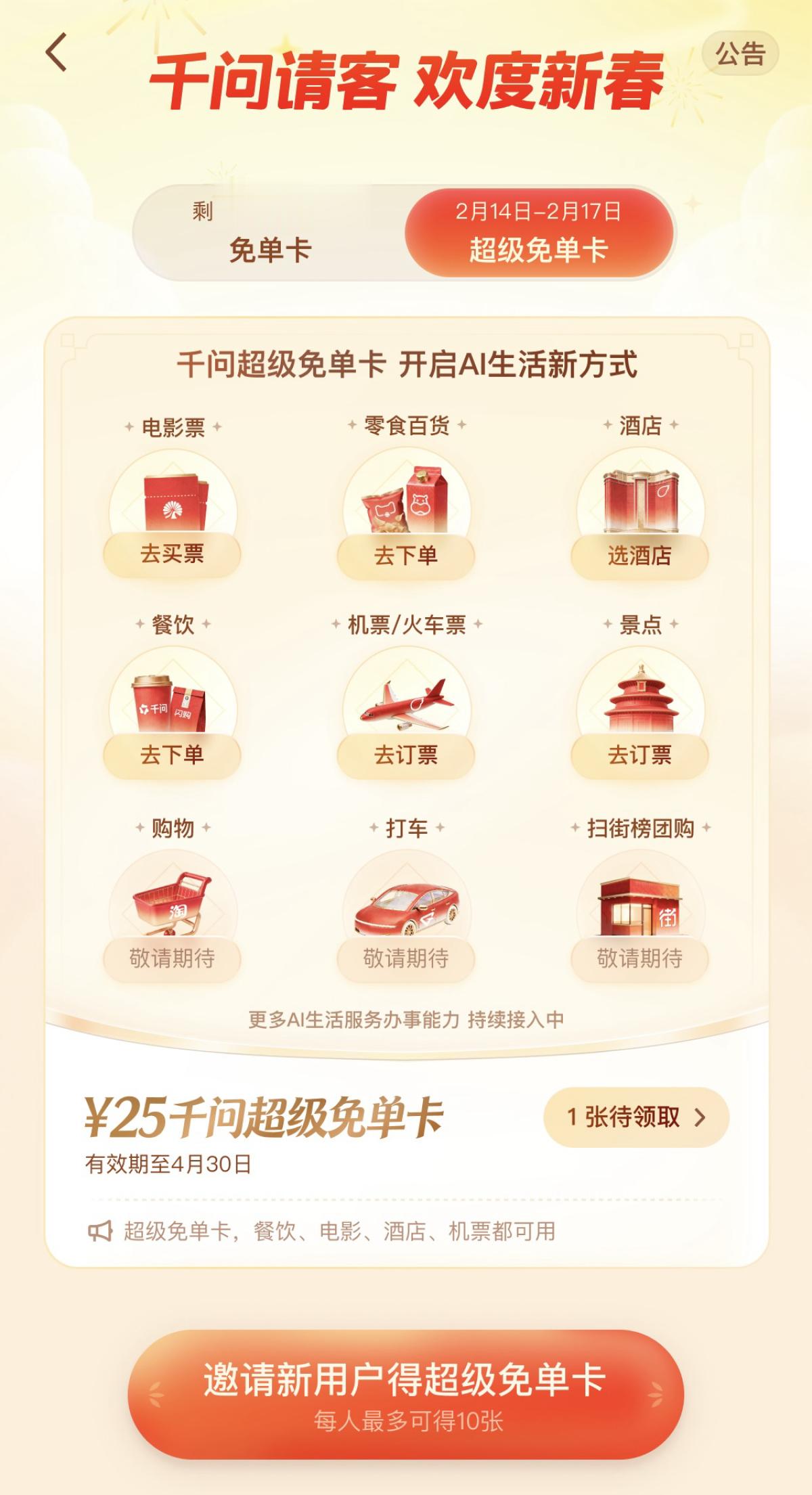 2月14日,千问突然宣布免单再加3天,接入大麦、飞猪,邀请全国人民体验AI买电影票、门票等新功能,激活春节AI新消费。从今天下午3点到大年初一,每个人可再领10张25元超级免单卡。