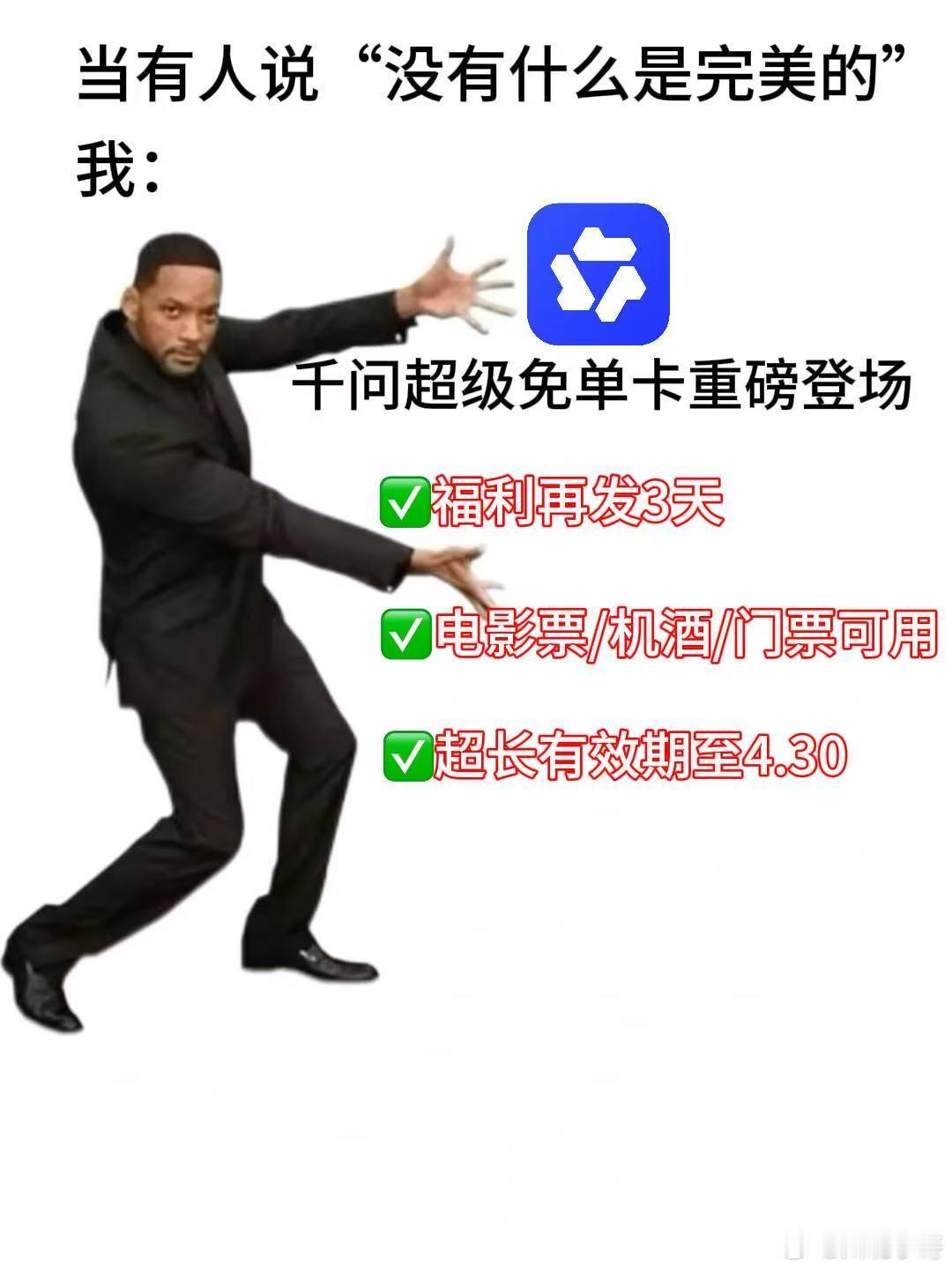 千问超级免单卡这波直接封神!我愿称之为羊毛天花板!吃饭、喝奶茶能用就算了,居然还能买电影票、景点门票、订机票酒店,一键抵扣25元,四舍五入等于白嫖!过段时间还能打车、逛淘宝买买买,主打一个全场景通吃。冒个泡不用凑单、不用套路,直接减钱,爽到飞起!有效期到4月30日,慢慢用不着急,这波福利不薅真的亏哭,赶紧冲就对了!