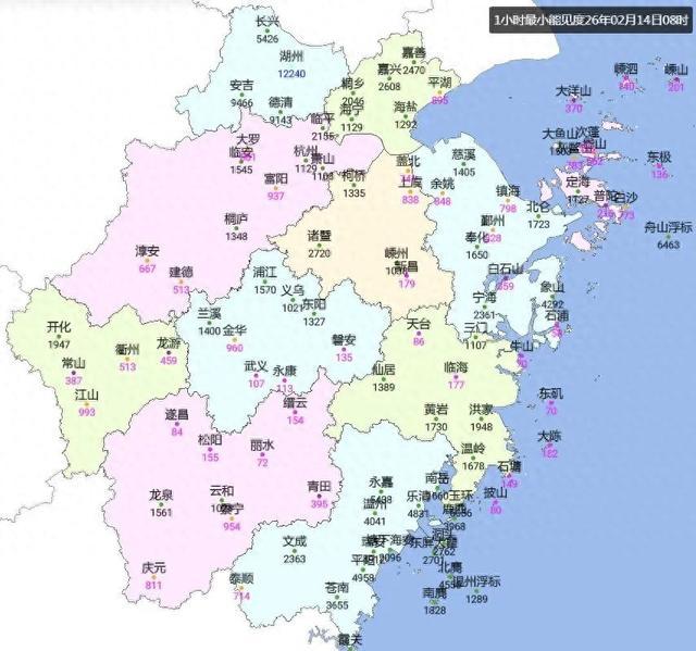 今日清晨沿海和内陆部分出现大雾,部分站点出现浓雾,丽水能见度甚至不足100米。由于湿度较大,预计今天夜里到明天上午沿海和部分内陆仍有雾,能见度降低,出行请注意交通安全。