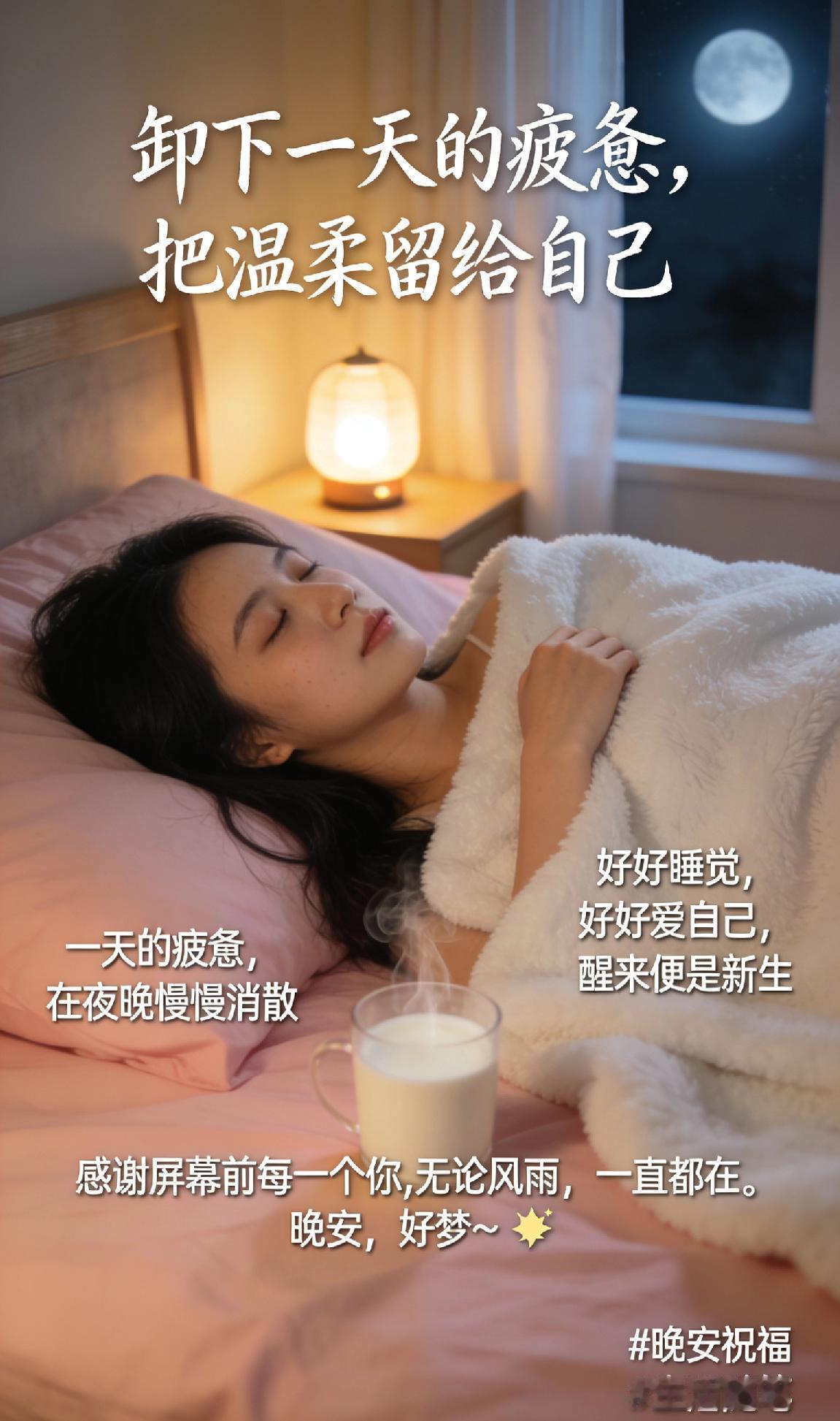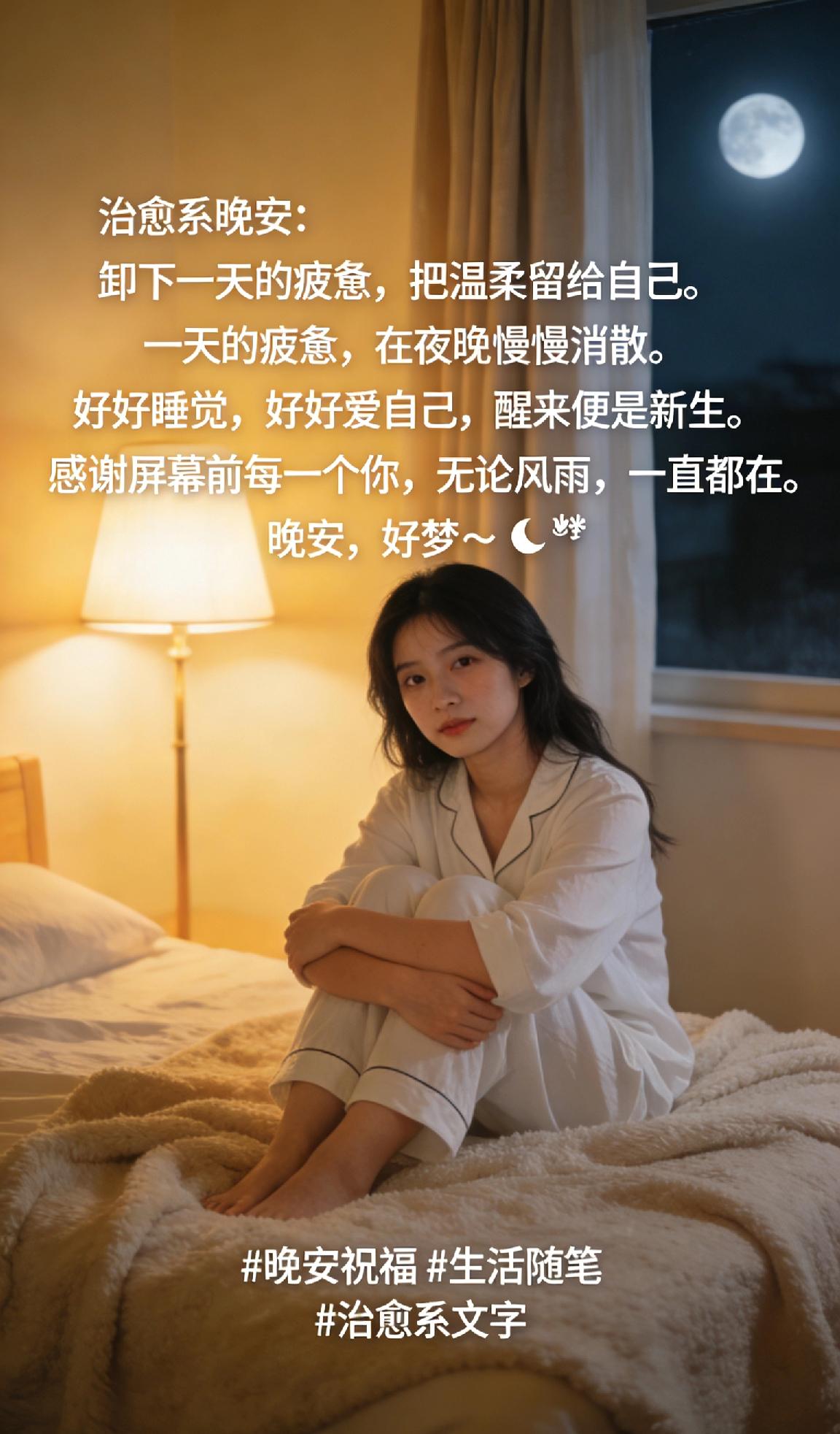 治愈系晚安:卸下一天的疲惫,把温柔留给自己。** 一天的疲惫,在夜晚慢慢消散