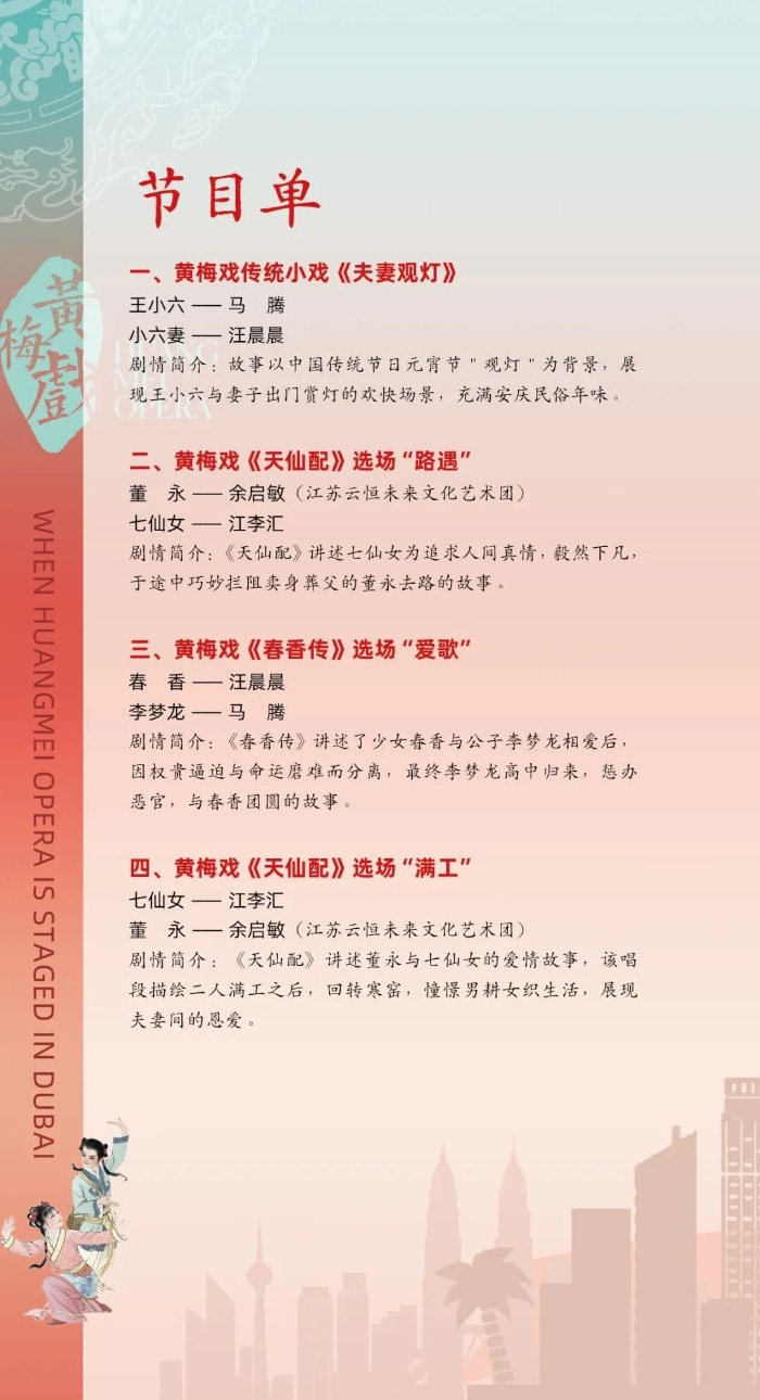 来自安徽再芬黄梅艺术剧院和江苏云恒未来文化艺术团的演员们受邀演出精彩的黄梅戏折子戏专场,经典黄梅戏《夫妻观灯》《天仙配》《春香传》等轮番上演。原汁原味的黄梅戏在迪拜唱响,为“迪拜中国新年”增添浓浓的中国年味和一抹让人深深眷念的乡音。除此之外,还将在当地呈现黄梅戏快闪,以轻盈灵动的方式拉近中国传统艺术与国际观众的距离。
