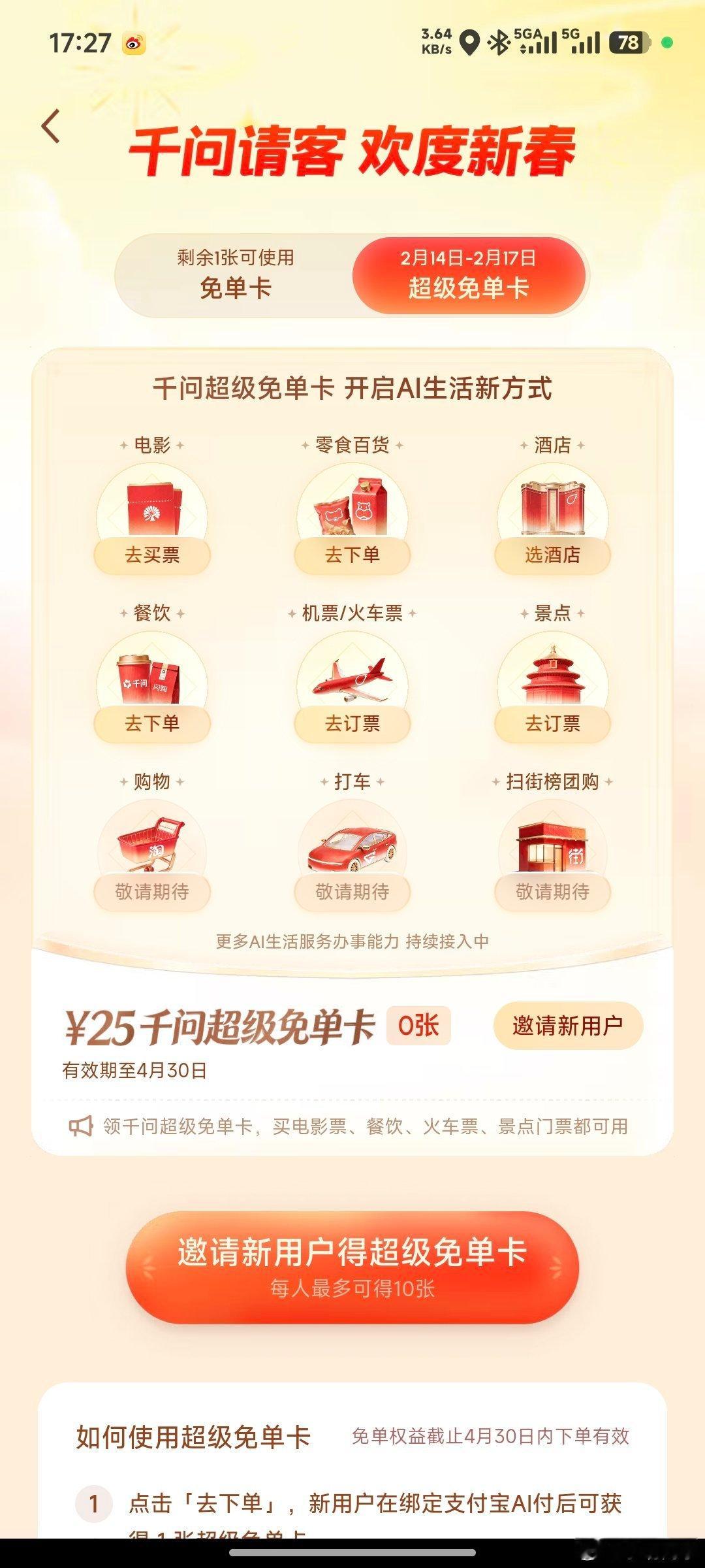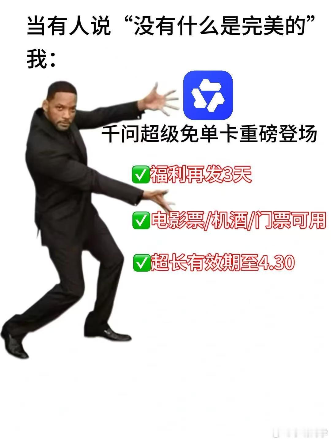 千问超级免单卡 马上就要到春节了,千问的福利还在加码。今天千问又推出了超级免单卡,使用它点奶茶只是基本操作,这个28元的优惠还能买景点门票、买电影票甚是订机票酒店。这个架势不只是让你薅到羊毛,还得必须让你用了它。把无门槛福利彻底做到0门槛。这个免单卡的有效期一直到4月30日,领到的宝子们别忘了使用。