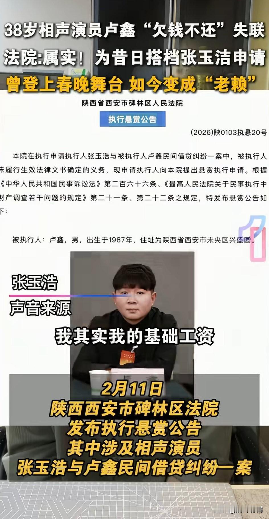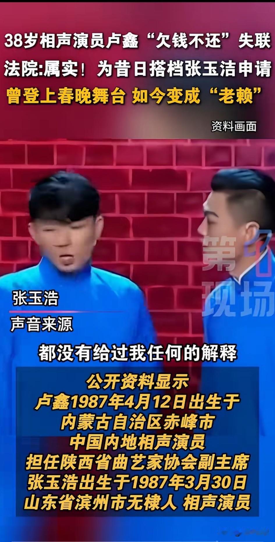 万万没有想到这么出名的相声演员卢鑫居然成了老赖,告他的还是张宇浩?他的相声搭档! 两人曾经还登上过央视春晚,也算是出名的相声演员了,后来还参加过笑傲江湖,并且一同创立了相声新势力这个公司品牌! 本以为可以继续赚钱,可万万没想到合作开了公司之后,搭档卢鑫居然拿公司去做担保,结果被人起诉成了老赖! 如今的搭档张浩玉也被连累了,不得不将他告上法庭,张浩玉表示自己从公司要拿1分钱,就连工资也没有给开! 现在居然还要替他背债,这谁能忍?大家对于著名相声演员卢鑫成了老赖这事怎么看? 相声 张玉浩卢鑫关系破裂 卢鑫玉浩纠纷