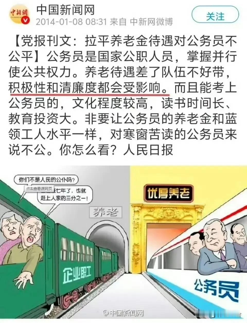 有网友发帖称:用财政经费形成的所谓多缴,用养老基金发放的数十个月的抚恤金,用行政经费变相的所谓职业年金都属于改制方向! 网友们应该明白,他们虽然不是特殊人群,但是,他们却肩负着社会治理的神圣使命,所以,有一个稳定的队伍对国家发展有益。如果想让优秀人才留在这支队伍中,就应该解除他们的后顾之忧,其退休待遇必须有充分的保障,那就是他们的养老金应该高于其他群体。 对此,早在2014年官方媒体就探讨了养老金问题,把不同群体的养老金比喻为绿皮火车和高铁。因为,养老待遇差了,队伍就不好带了,积极性和清廉都会受影响。所以,我们应该支持这个群体的养老金高于其他群体。