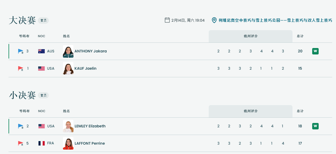 虎扑02月14日讯自由式滑雪女子双人雪上技巧决赛已经结束,澳大利亚选手杰卡拉-安东尼20-15战胜美国选手杰琳-考夫获得金牌,考夫获得银牌。