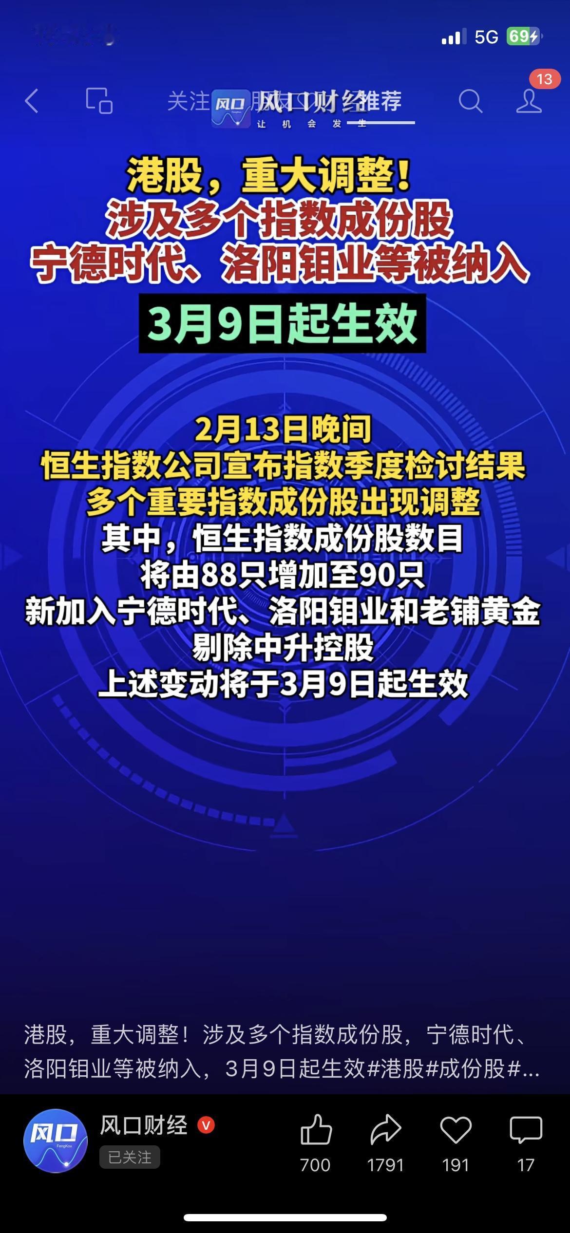 港股要变天了!恒生指数从88只扩容到90只,宁德时代、洛阳钼业、老铺黄金等被纳入,3月9日生效。 这可不是小事: • 宁德时代作为新能源龙头,纳入后有望吸引被动配置资金。 • 老铺黄金受黄金行情带动,关注度有所提升。 对咱普通投资者来说,别盲目追新,记住:指数调整是资金信号,不是直接买入信号。 你有没有配置港股相关基金? 市场有风险,投资需谨慎。 港股调整 恒生指数 宁德时代