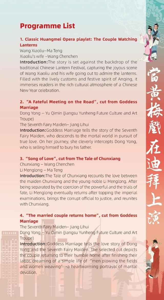 来自安徽再芬黄梅艺术剧院和江苏云恒未来文化艺术团的演员们受邀演出精彩的黄梅戏折子戏专场,经典黄梅戏《夫妻观灯》《天仙配》《春香传》等轮番上演。原汁原味的黄梅戏在迪拜唱响,为“迪拜中国新年”增添浓浓的中国年味和一抹让人深深眷念的乡音。除此之外,还将在当地呈现黄梅戏快闪,以轻盈灵动的方式拉近中国传统艺术与国际观众的距离。