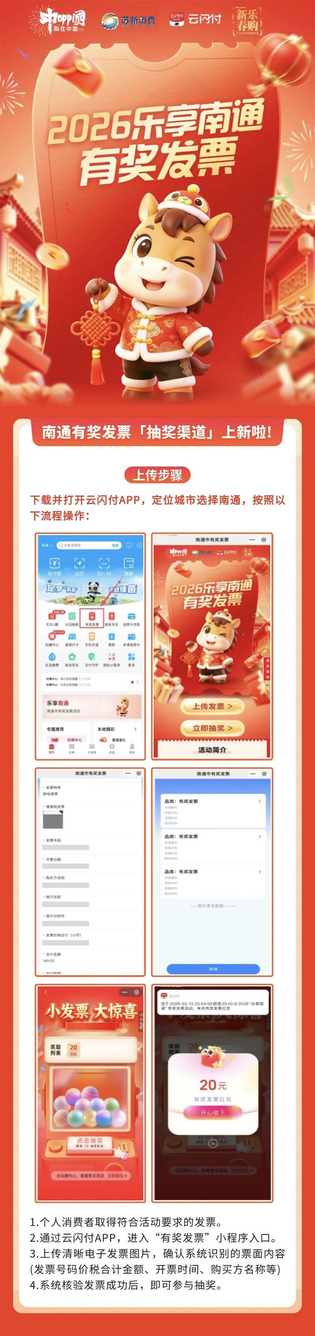 该活动由市商务局、市税务局联合主办,将持续至3月31日。活动覆盖崇川、通州、海门、南通经济技术开发区、苏锡通园区、通州湾示范区。个人消费者在活动区域内住宿、餐饮企业非充值消费满150元(含税),取得符合活动规则的发票并通过活动平台上传后,系统核验通过即可获得抽奖资格。每人每天最多可上传3张有效发票,每张发票拥有每日小奖和终极大奖各一次抽奖机会。