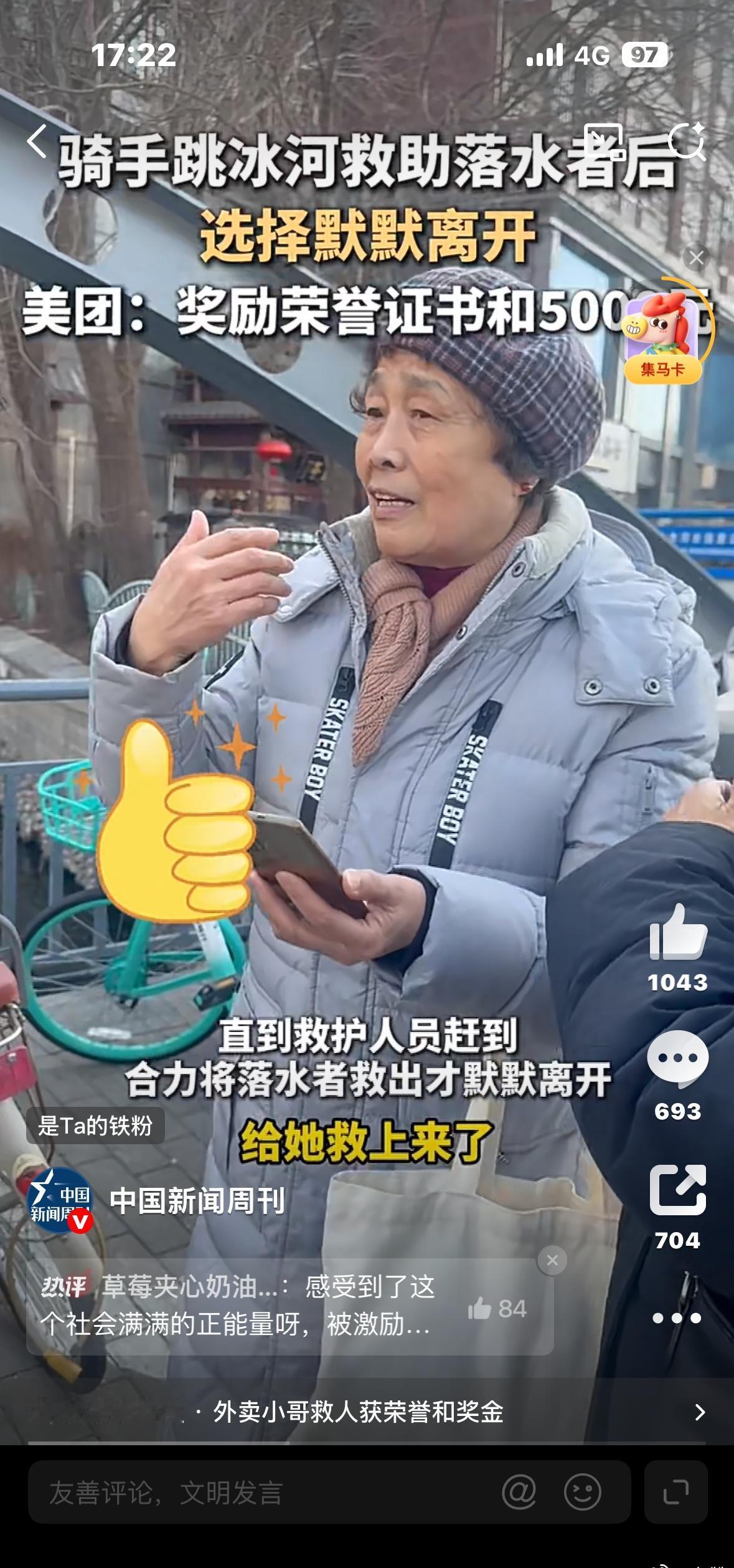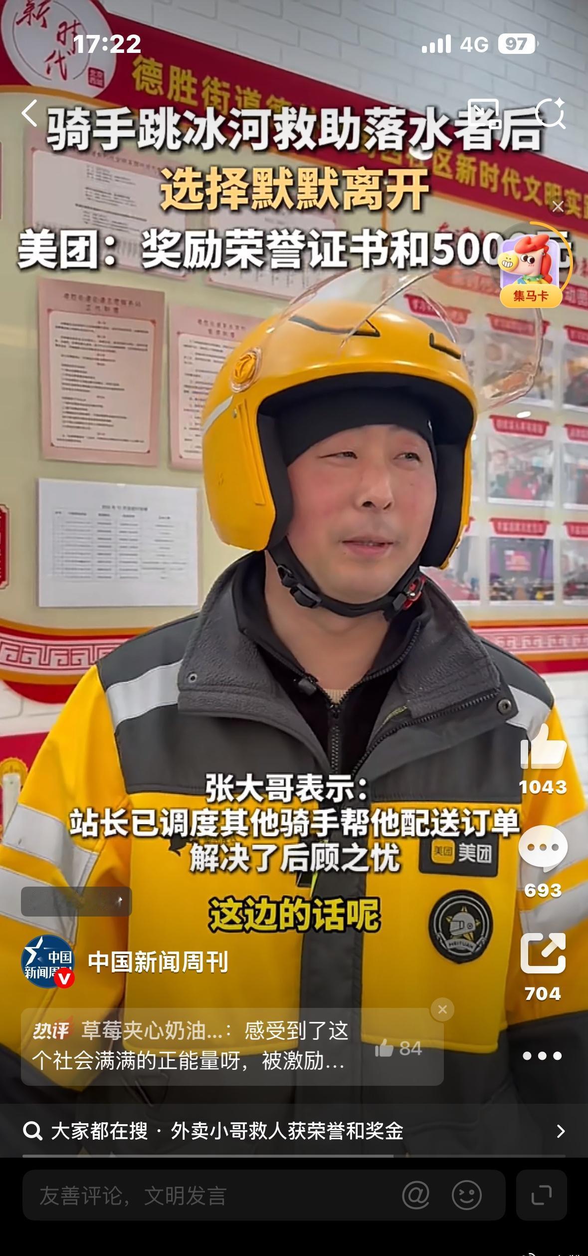 ←送单途中撞见有人落水,想都没想就跳冰河救人,河堤高爬不上来,就一直在水里托举着落水者,直到救援人员来才默默离开,这股子勇劲儿和善良真的太戳人了!还好站长及时调度帮送单解了后顾之忧,社工登门慰问,平台也给了荣誉、奖金和保暖服,善举被看见、被善待的样子真的超暖心