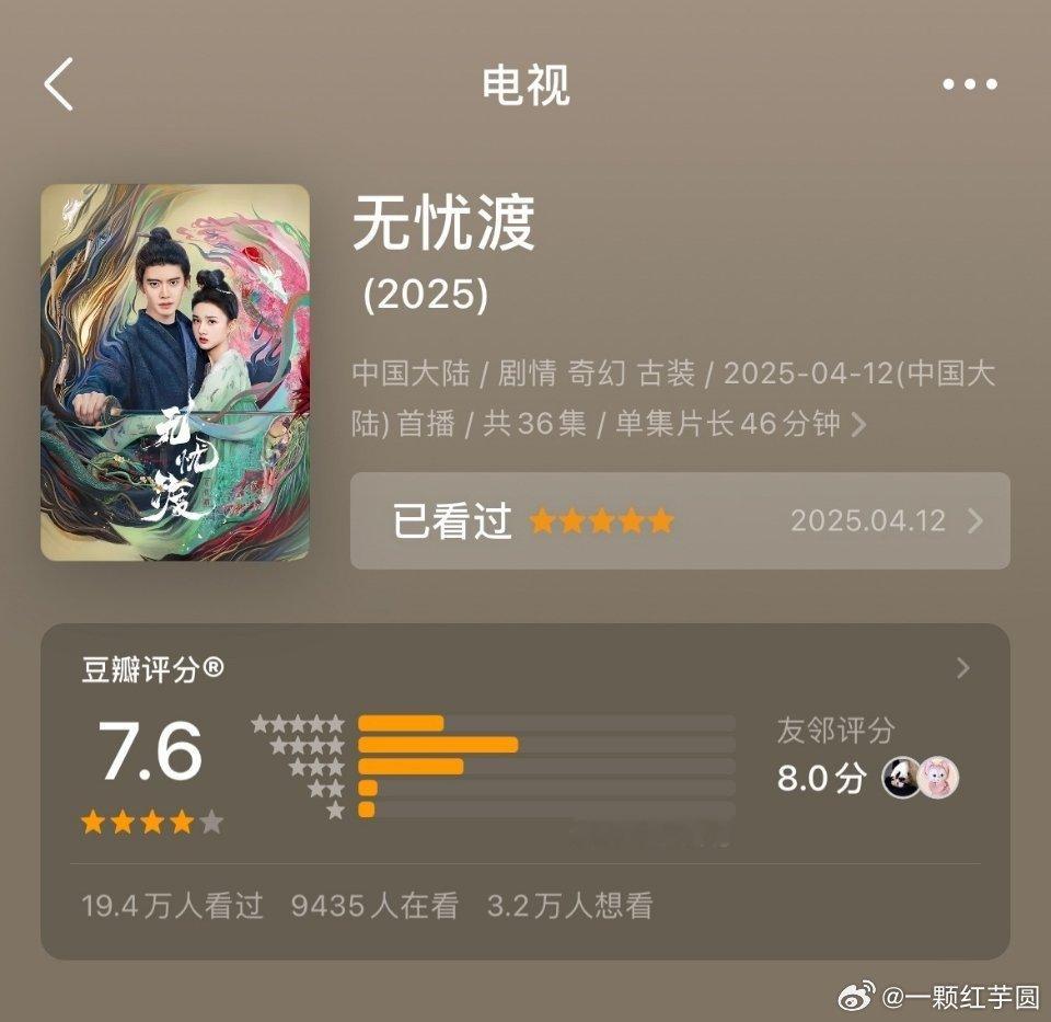 谁拉表这么缺德啊(图一二)?排除《无忧渡》就能抹掉人家的高分数,好口碑吗?那我要大声说: 《无忧渡》豆瓣7.6!《无忧渡》是2025年爱奇艺站内【最高分也是唯一9分剧】!!