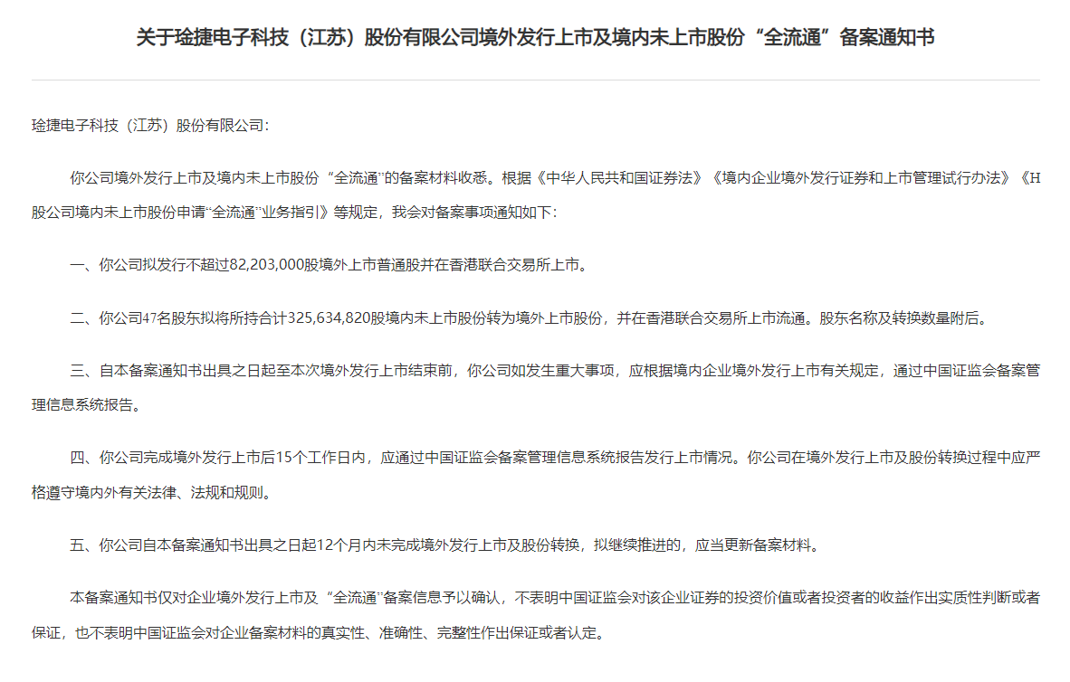 2月14日,中国证监会国际合作司发布《关于琻捷电子科技(江苏)股份有限公司境外发行上市及境内未上市股份“全流通”备案通知书》。公司拟发行不超过82,203,000股境外上市普通股并在香港联合交易所上市。公司47名股东拟将所持合计325,634,820股境内未上市股份转为境外上市股份,并在香港联合交易所上市流通。
