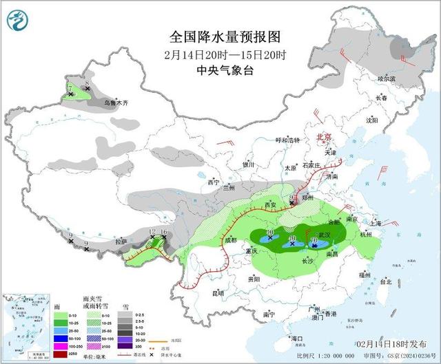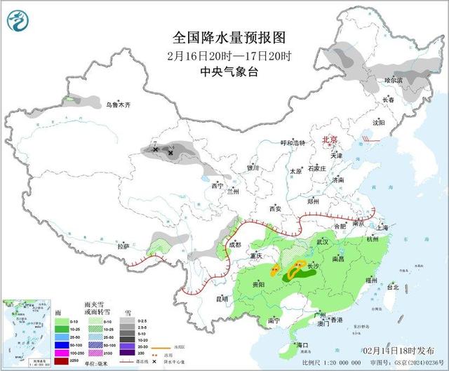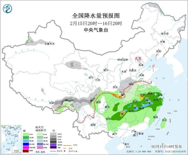 14日夜间至16日,西南地区东部、江南、华南等地有小到中雨,其中,15日,江南北部、江汉局地有大雨或暴雨,部分地区伴有雷电,局地有短时强降水或冰雹等强对流天气,湖北西部和湖南西部山区等地局地有冻雨;新疆沿天山地区、伊犁河谷、西藏东部、川西高原、西北地区南部、华北西南部、黄淮西部、内蒙古东北部、黑龙江等地部分地区有小到中雪或雨夹雪,新疆伊犁河谷、西藏东部、河南西部、湖北北部等地局地有大雪或暴雪。