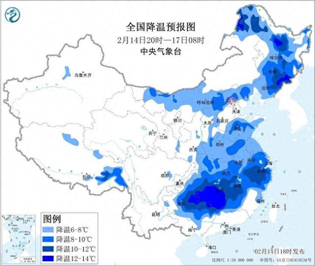 图1全国降温预报图(2月14日20时-17日08时)