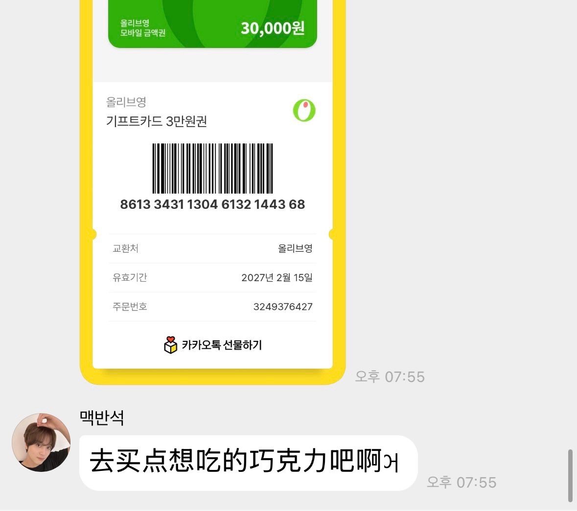 在情人节给自己的女人们送了30张Olive Young三万元(约150元)券买巧克力的NCT楷灿