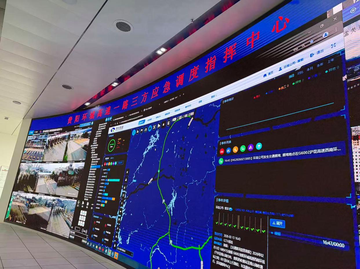 贵阳城发集团环高营运公司营运事业部部长梁颖:“容易拥堵的路段主要集中在干井枢纽和白云枢纽的位置我们的大屏上对车辆实时进行系统分析,我们主要是针对车速、车流以及事件、天气的情况进行综合的判断。”