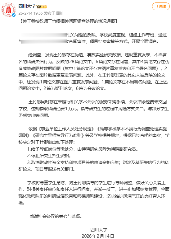 新京报讯2月14日,四川大学官博发布关于教师王竹卿相关问题调查处理的情况通报,内容如下: