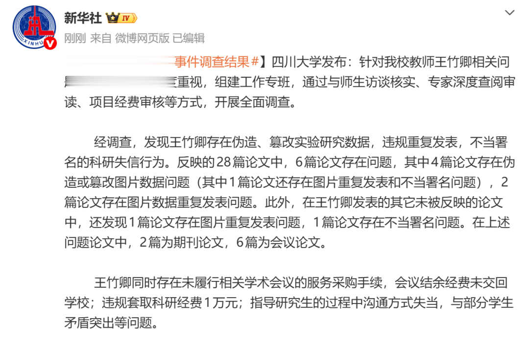 2月17日,四川大学发布《关于我校教师王竹卿相关问题调查处理的情况通报》,全文如下:
