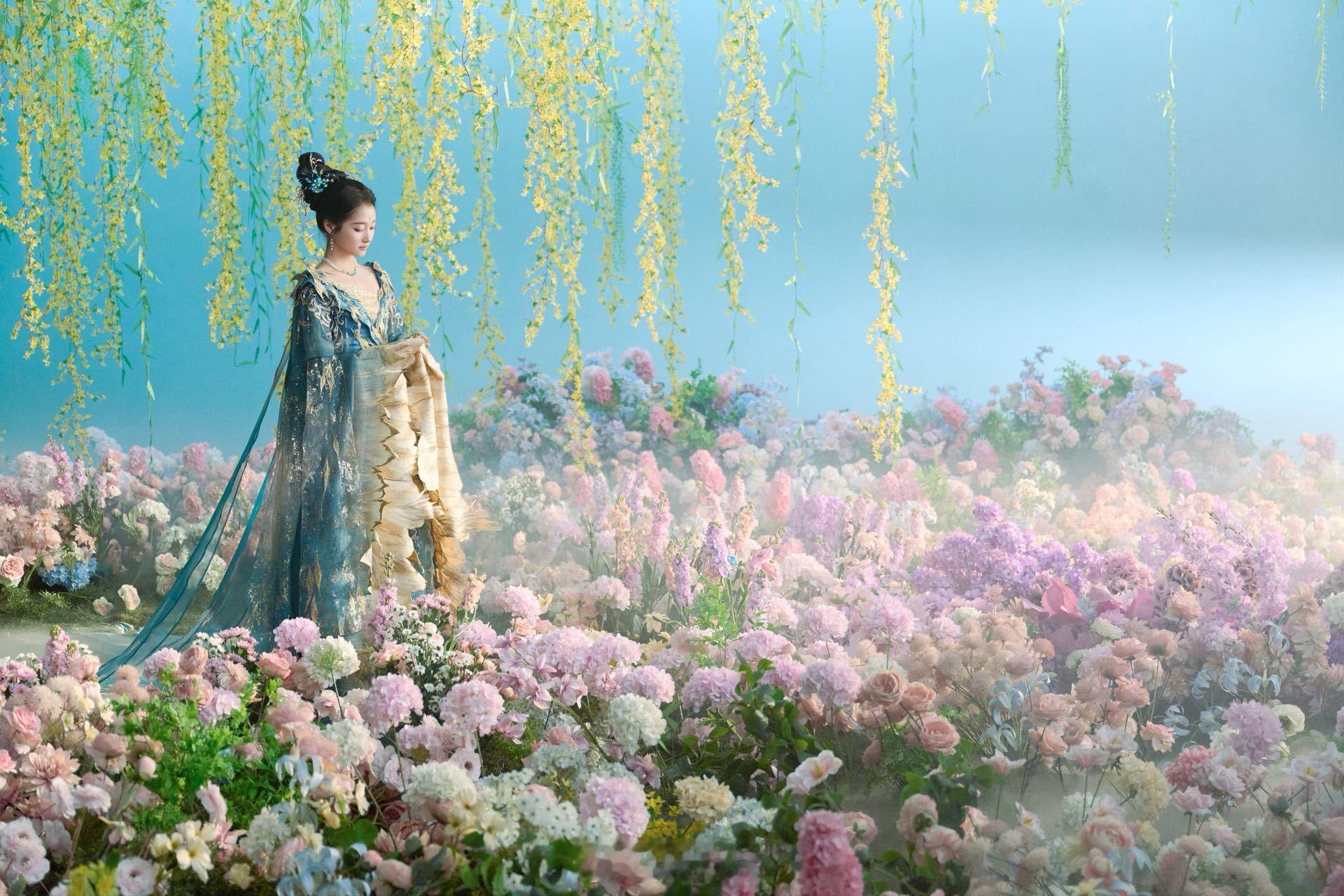 关晓彤青绿国风扮相 关晓彤河南春晚这身蓝金纱裙太绝了!流光感的面料配上精致纹样,