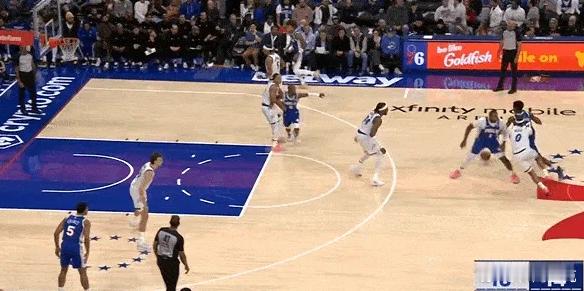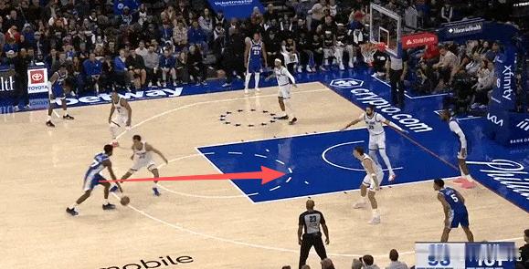 P1-4埃奇库姆手递手发起的“西班牙挡拆”(Stack),行进间回头观察追防人、顺下庄神和弱侧的情况,随即衔接二次加速,打出了节奏变化,马克西的背掩护质量相当扎实,阻止了卡特回退护框,使得贝恩被迫换防承担护框职责,VJ一记欧洲步上篮打进。