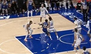 P11-14左手持球目光看向斜前侧,等待队友落位后直接佯装左路的突破,然后迅速变向走右路,过掉蒂尔曼后直杀篮下,迎着协防的布朗直接起单手劈扣。