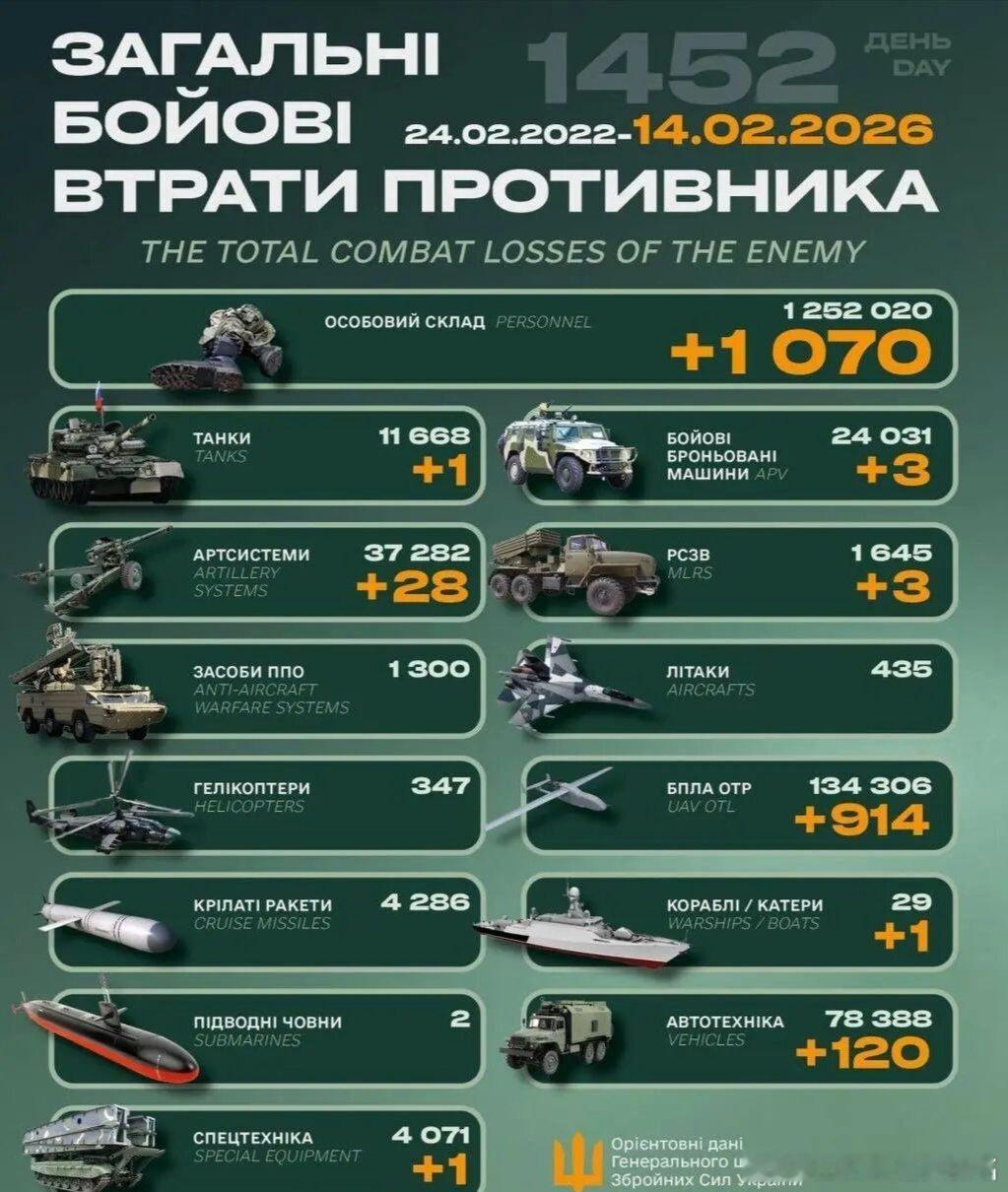 乌俄战争进入第1452天,乌克兰总参谋部发布战报:过去24小时乌俄双方交战82次,其中18次在胡利亚伊波列(11次在苏梅)、11次在托列茨克、8次在莱曼、26次在波克罗夫斯克、7次在南顿涅茨克区域。毙伤俄1070名。俄军累计损失1252020人。摧毁俄1辆坦克、3辆装甲车、28门火炮、3个火箭发射装置、914架大型无人机、120辆军车、1件特种设备、1艘军舰。