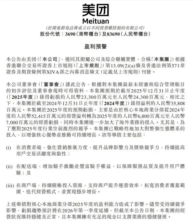 2月13日,美团在港交所发布盈利预警公告表示,集团预期于截至2025年12月31日止年度(2025年度)录得亏损约233亿至243亿元。相比之下,该集团2024年度录得盈利约358亿元。