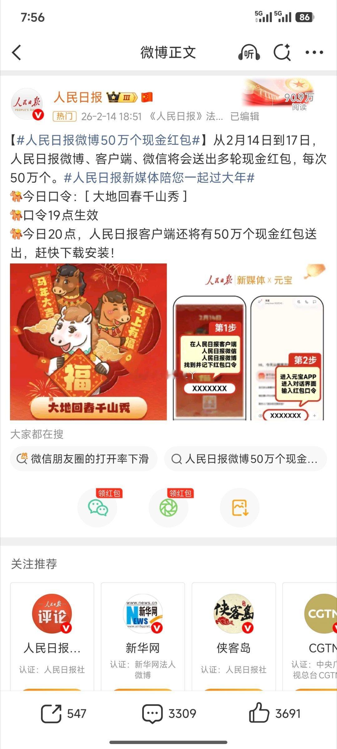 人民日报新春红包派送中,今日口令“大地回春千山秀”已抢空,别灰心!活动持续至17日,每日都有新福利,记得明天准时蹲守,好运马年不停歇!
