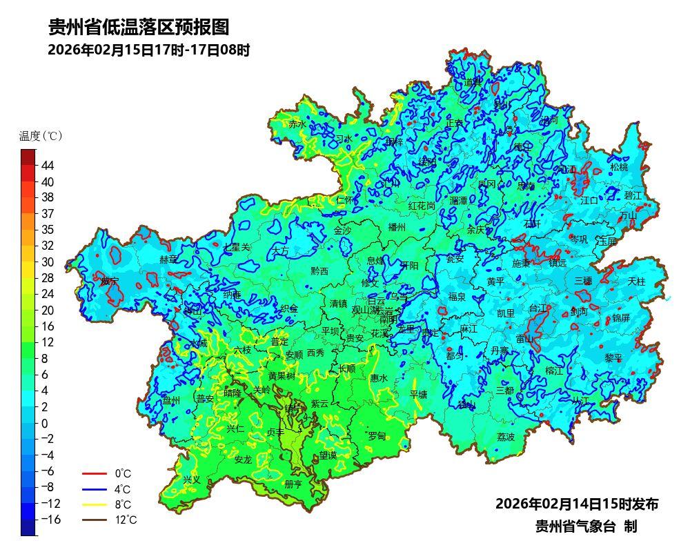 省气象台2月14日16时发布寒潮蓝色预警:受较强冷空气影响,预计2月15日17时至17日08时,我省中东部地区将自东向西先后出现寒潮天气(图1)。铜仁市(所有区县),黔东南州(所有区县),遵义市东部(红花岗区、湄潭县、务川县、余庆县、凤冈县、播州区),贵阳市东部(开阳县、南明区、乌当区),黔南州中东部(贵定县、都匀市、荔波县、三都水族自治县、瓮安县、龙里县、福泉市、独山县、平塘县)等地的最低气温降幅达8~14℃,至16日夜间到17日凌晨,上述地区的最低气温将降至1~5℃,个别高山地区最低气温降至0℃左右(图2)。其中,15日傍晚到夜间,冷空气开始影响铜仁市、黔东南州和黔南州东部,16日白天到夜间,冷空气继续自东向西影响我省其余地区,中西部最低气温降幅为2~8℃,最低气温将降至5~9℃。此外,15日白天,我省大部分地区天气晴好,最高气温可达17~25℃,夜间除西部地区外,各地转阵雨天气,东南部局地有雷电等对流天气。
