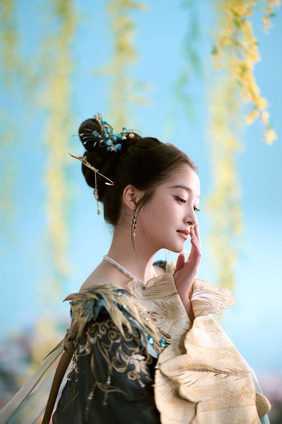 关晓彤青绿国风扮相 关晓彤这套国风造型太适合她了,青绿色系衬得气质温婉又贵气,裙