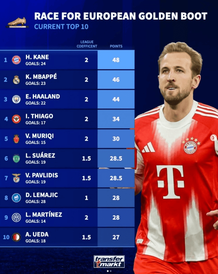 虎扑02月14日讯德国转会市场统计了本赛季欧洲金靴目前的积分情况,详情如下: